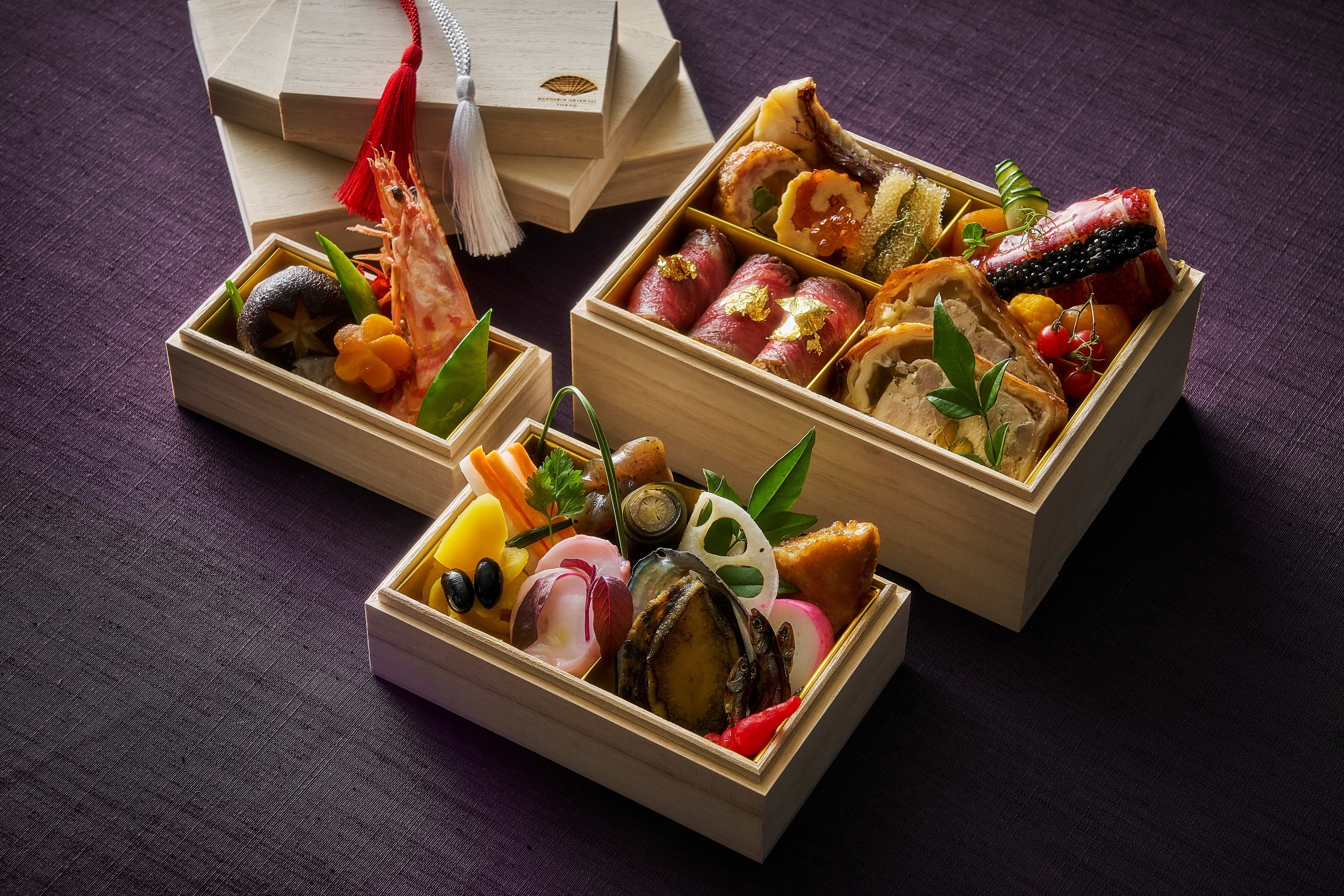 毎年人気の、お一人さまからお楽しみいただける三段重箱入りの和洋折衷のおせち。新年のはじまりに相応しく、オマール海老や鮑のコンフィなどの伝統的なおせちの縁起物を取り入れた一品から、金箔をあしらった栃木県産の国産牛ローストや岩手県産の希少なプラチナポークで作る八幡巻きなど、当ホテルのシェフが一品一品心をこめてご用意。彩り豊かな味わいを楽しめる、贅沢なおせちです。