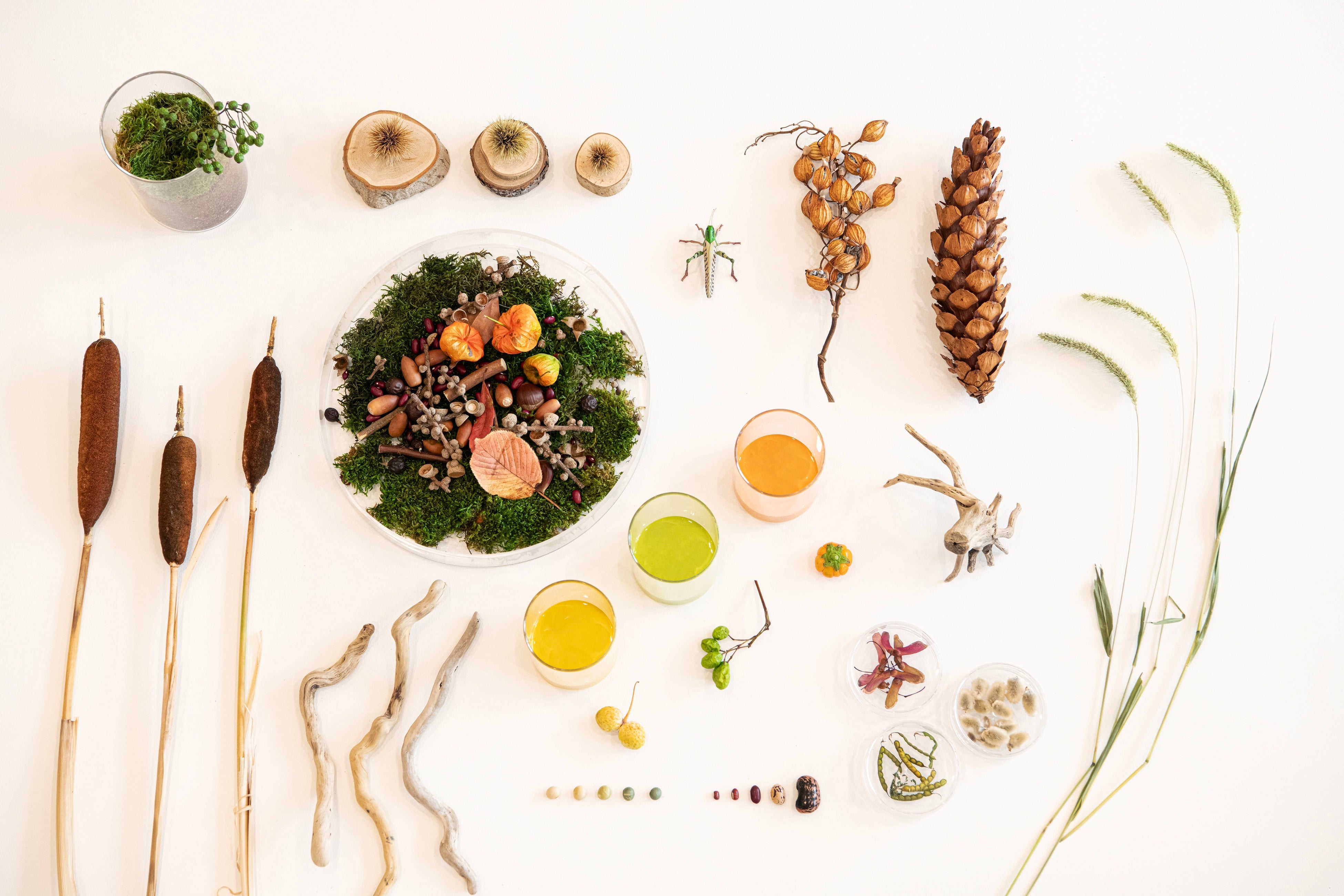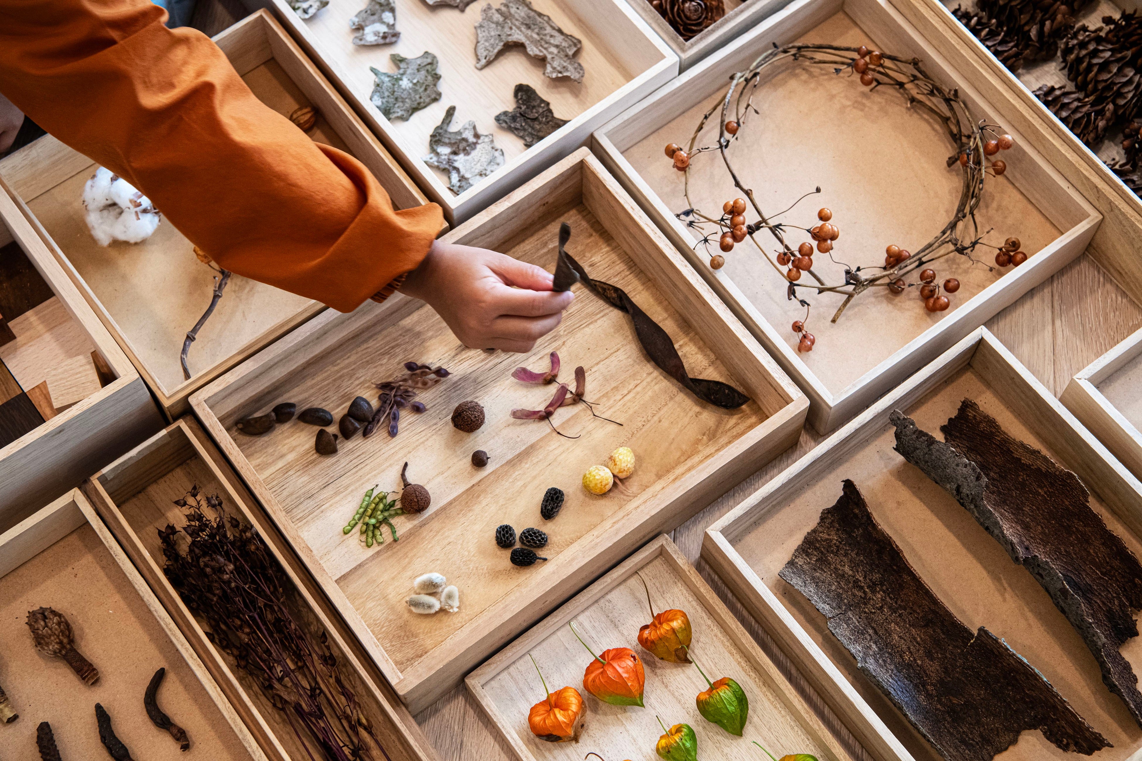 赤から黄のグラデーションが美しい葉っぱや、自然界で生き残る、命を繋ぐために変化したチクチク、コロコロとしたさまざまな形の木の実。海に運ばれてくる途中で丸く整えられた石、異なった質感と色、重さの枝や丸太。自然界には、多くの科学者や数学者も魅了した、ミステリアスで合理的な造形がたくさんあります。プロジェクトルームには、日本全国から集められた50種類以上の自然素材を用意。手に取り、じっくりと向き合うことで自然の多様な表情に気づくことができ、その力強さや繊細さとともに自然物が持つ不思議や面白さと出会います。