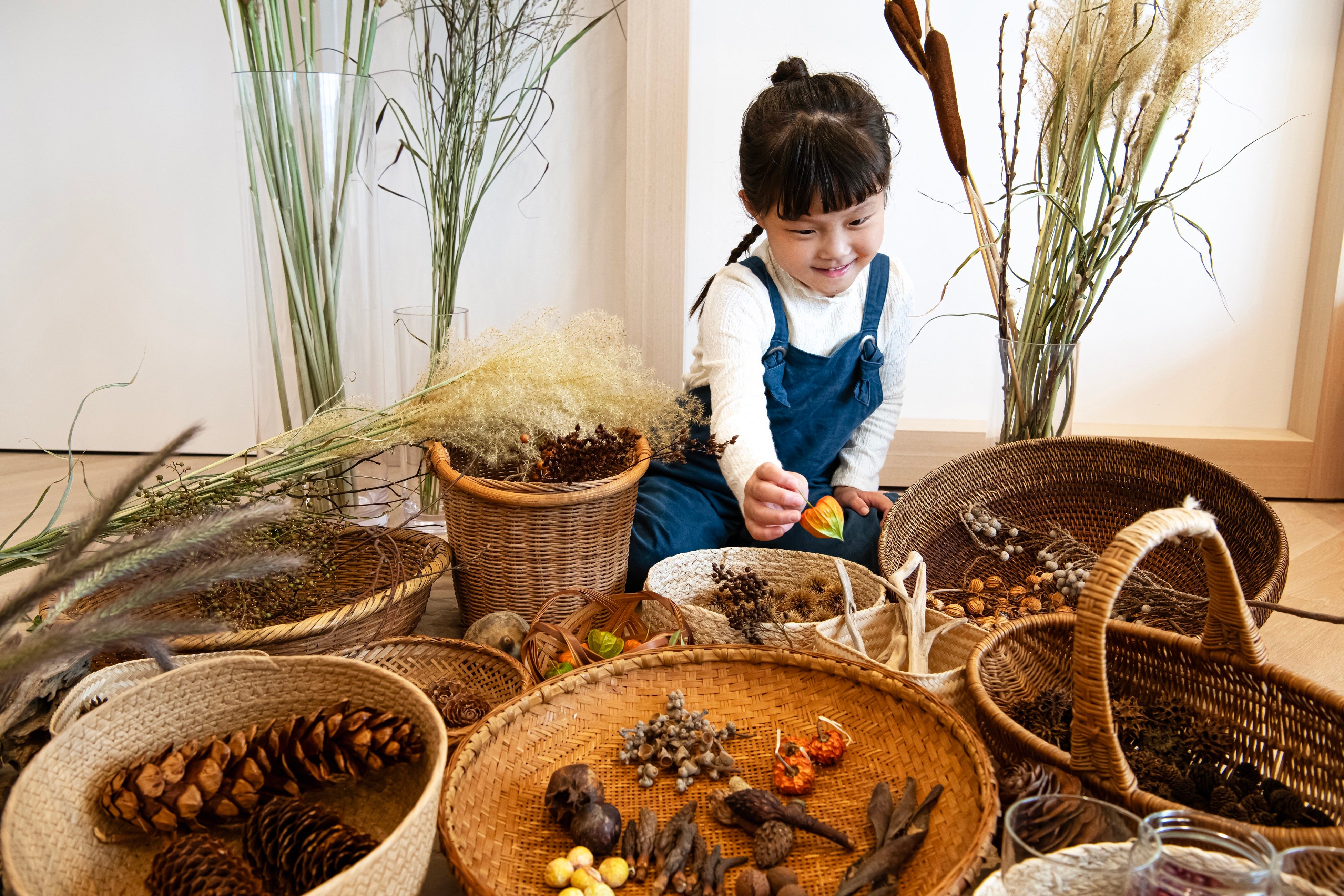 自然物を使ったミニランドスケープデザインが体験できます。土の上に草や苔が生い茂る「土壌」、生き物に欠かせない「水辺」、「木々」とその周りには新しい生命と繋がる「木の実」など。自然物一つ一つの色や形を見つめ直し、自然物の組み合わせ、自然と生き物の関係性を探究します。一人でその世界を深めたり、みんなで協力して大きなフィールドができたり。マイクロスコープを使って「虫の視点」を体験し、そこに棲む新しい生き物をつくって、動かして自分だけのストーリーを制作することもできます。自分で感じ、問いをたて、プロジェクトルームいっぱいの大きなスケールで、自然物を用いて秋の世界を創造します。アトリエでたくさんの自然と触れて探究した子どもたちは、旅から帰っても、街路樹や近隣のさりげない自然物に目を向けた時、自然の色彩や質、形の面白さに気づきやすくなります。