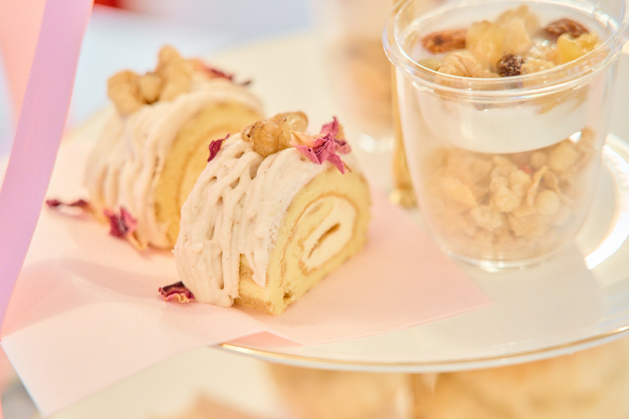 カスタードのロールケーキにマロンクリーム、上にクルミ、ドライローズ。