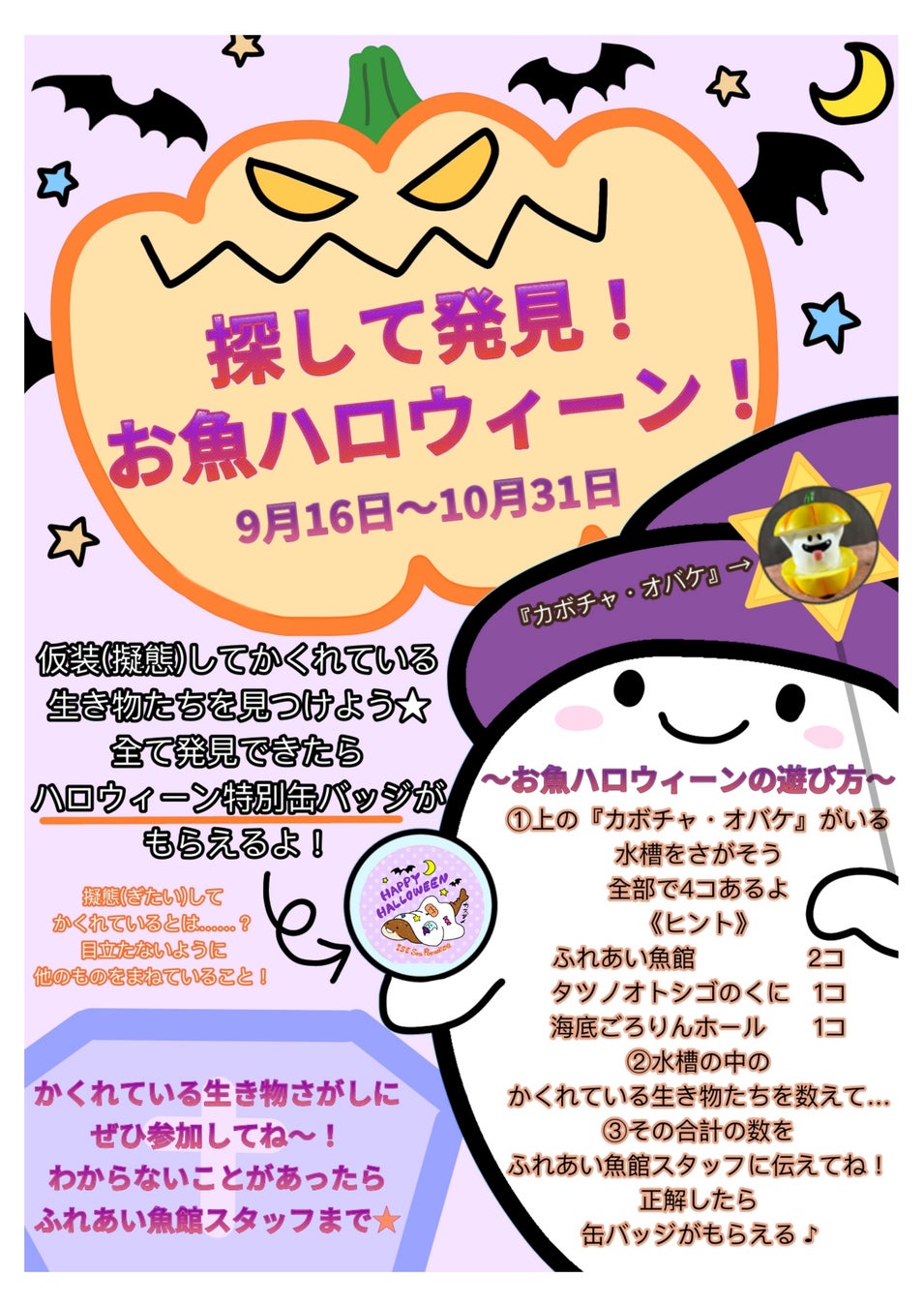 その生き物たちの合計の数をふれあい魚館にいるスタッフに伝えて正解すると、ハロウィーン限定オリジナル缶バッチがもらえます。