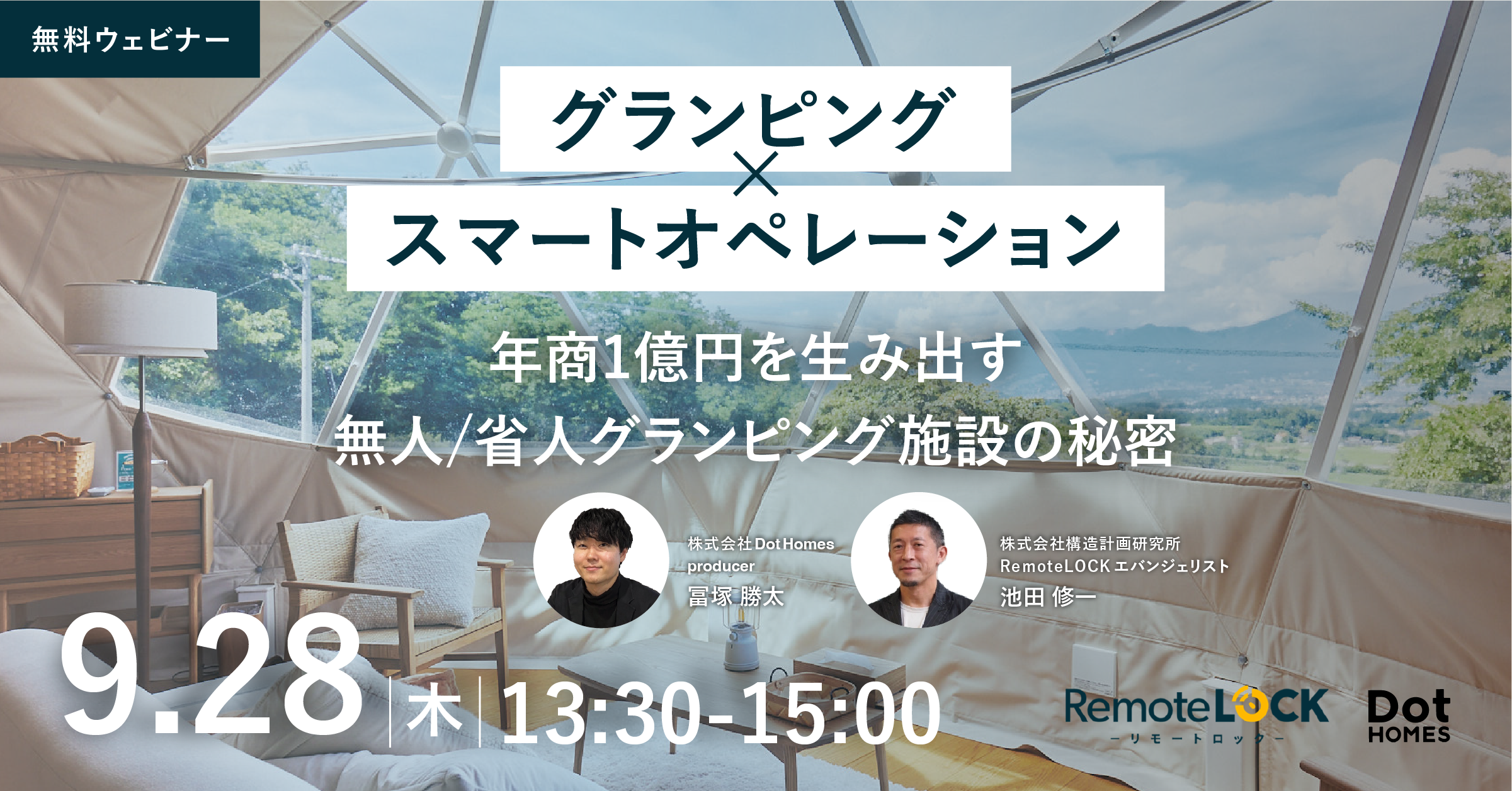 今回は、Dot Homesより、データから解析したグランピング市場の需要、グランピング開業における重要ポイントをこれまでの開業経験を元にお伝えするほか、差別化ができる無人のグランピング施設開業までに必要な要素をRemoteLOCKと共催をし皆様にご紹介いたします。