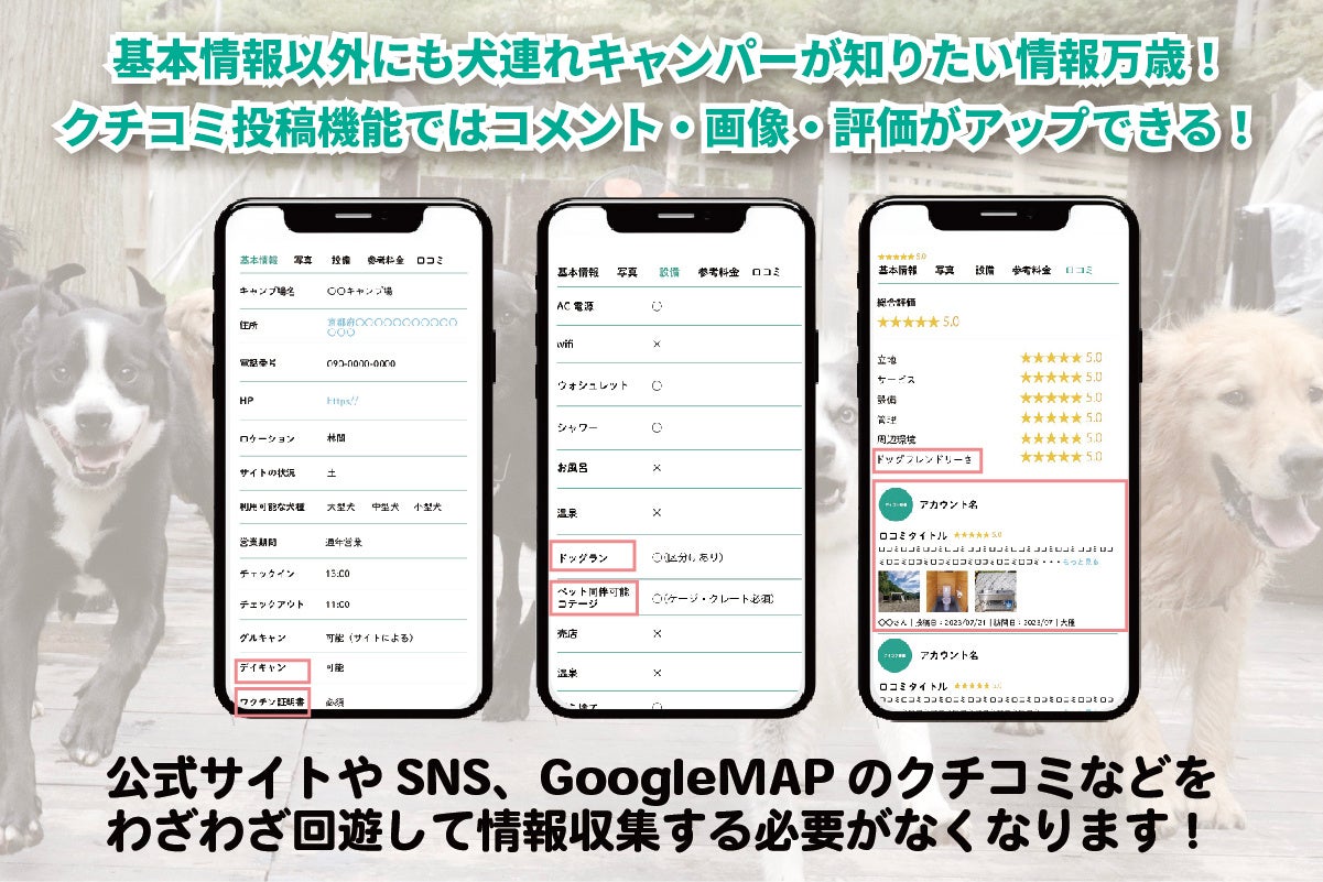 「わんグリーンマップ」では全国のペット同伴可能なキャンプ場を検索できます。既存のキャンプ場検索サービスでは、ペット同伴可能かどうかの確認はできても、犬連れキャンパーが知りたい情報があまり載っていません。そのためYoutubeや各種SNS、公式サイトや個人ブログなどあらゆるサイトを回遊して情報収集する必要がありました。