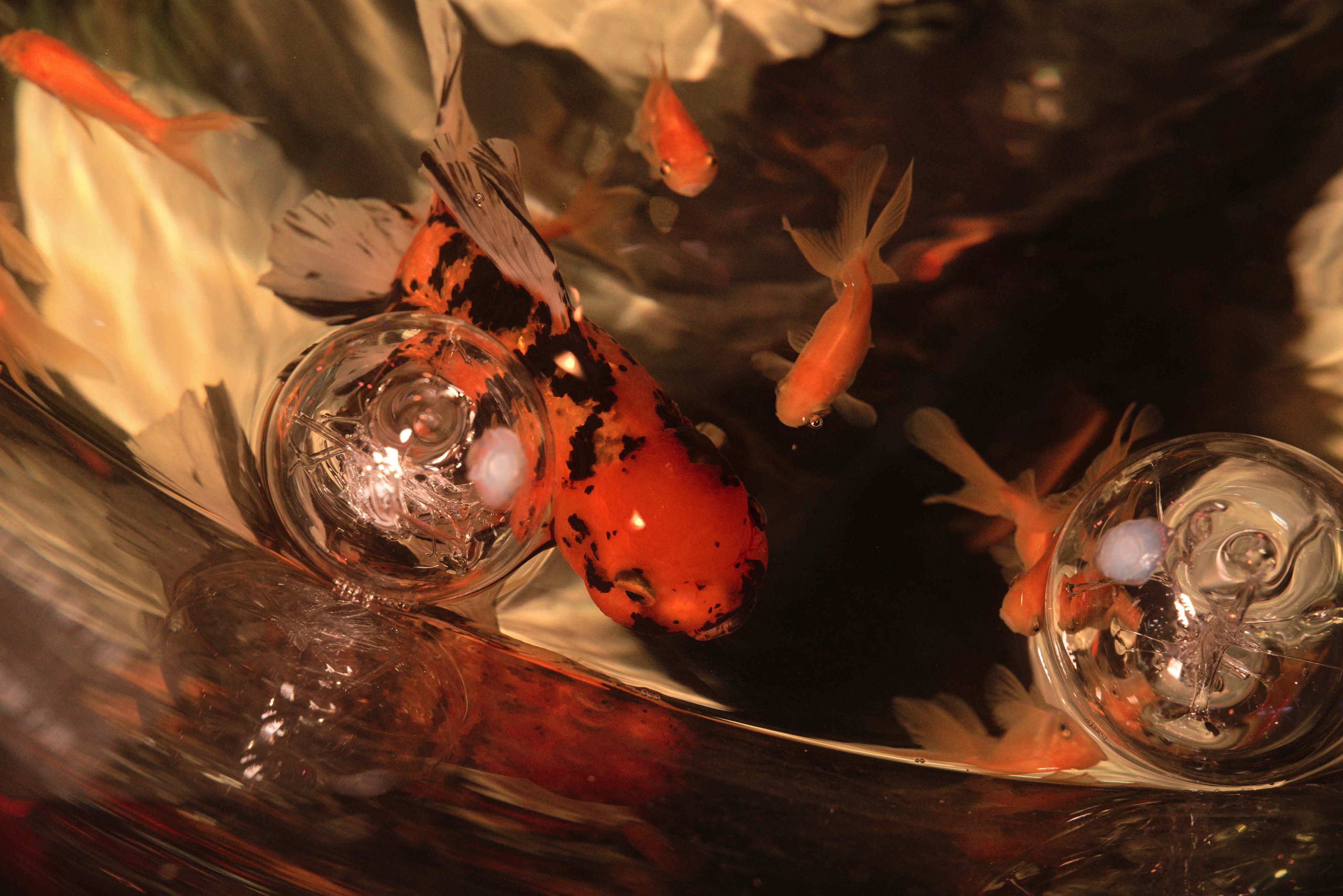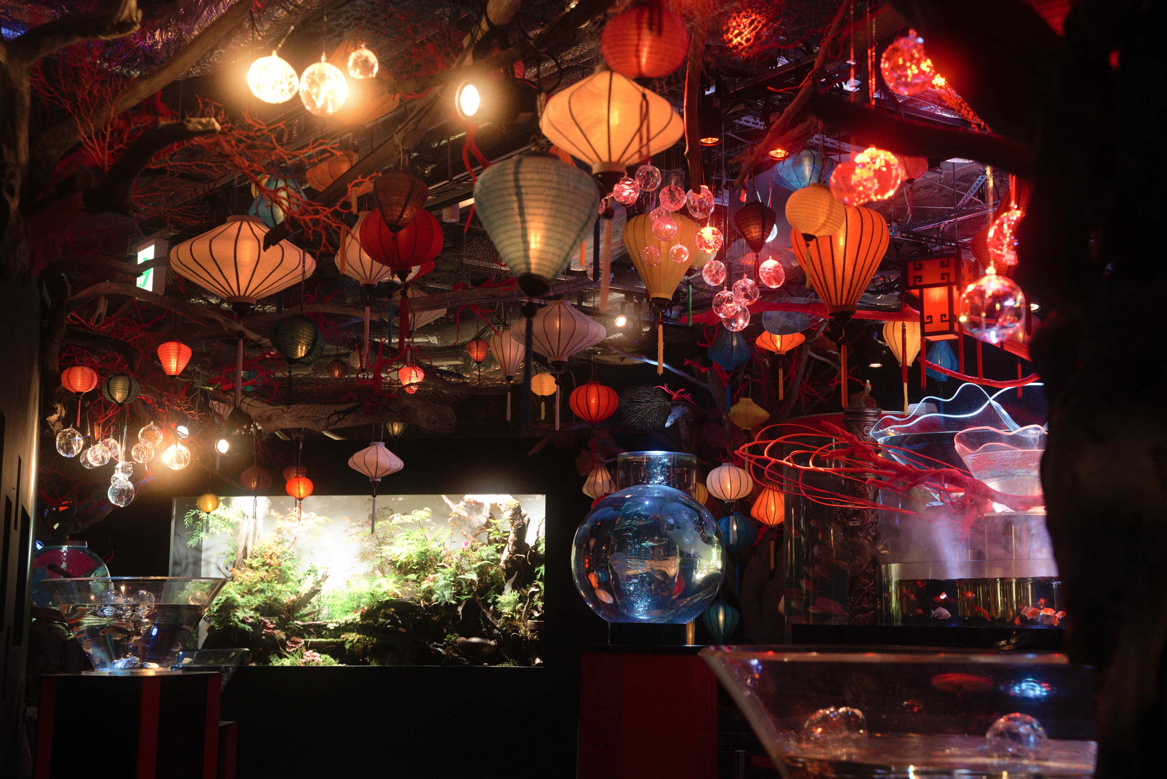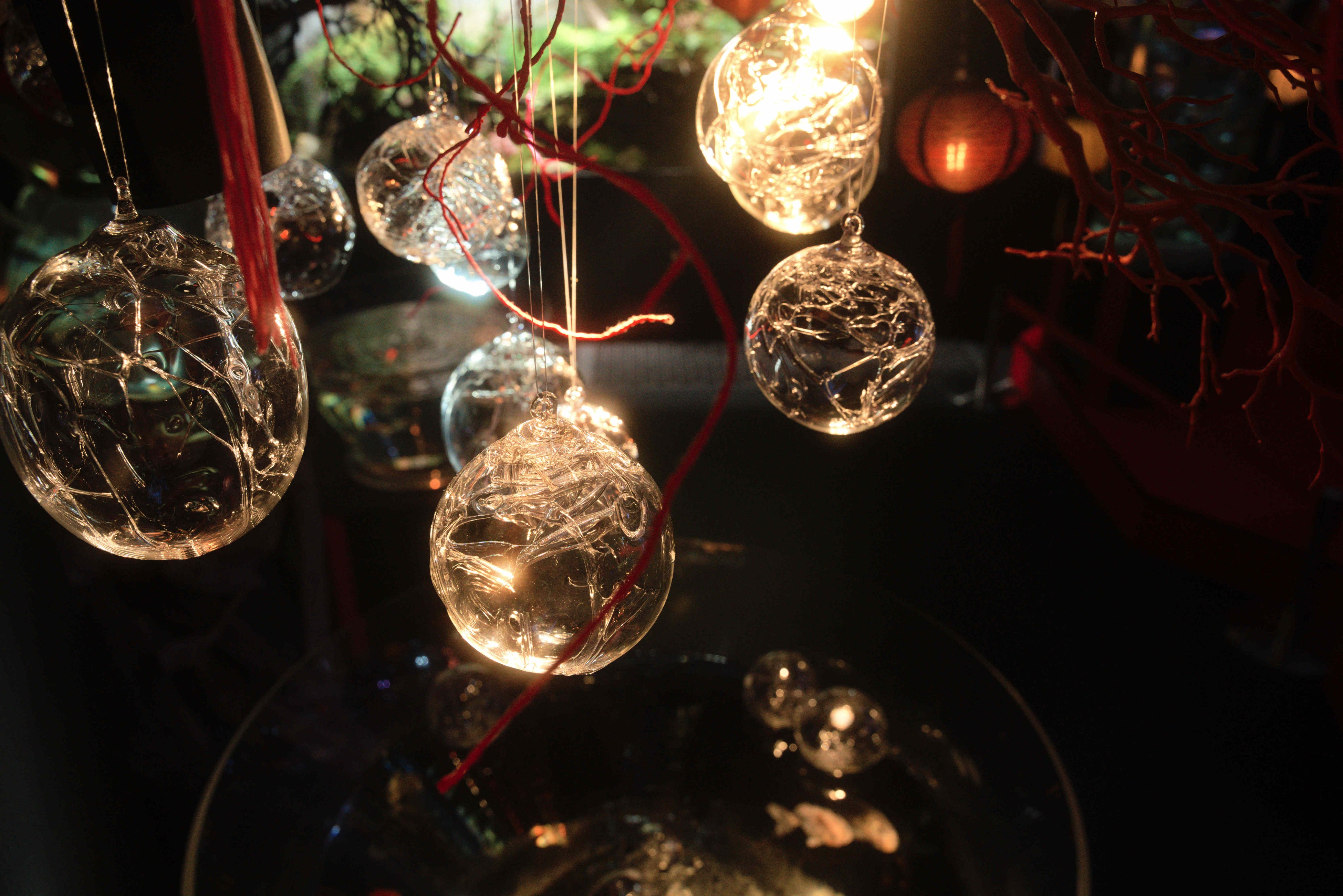 直径 5〜15cm のガラスの球体「月夜実(つくよみ)」を、エリア5「龍宮~RYUGU」へおよそ50個装飾。日本神話に登場する月を司り、夜を統べる神として知られる「月読命(つくよみ)」を、ガラスの球体として表現しました。光を透過させて空間に投影する事で、神が作った世界が映し出された様子をイメージしています。