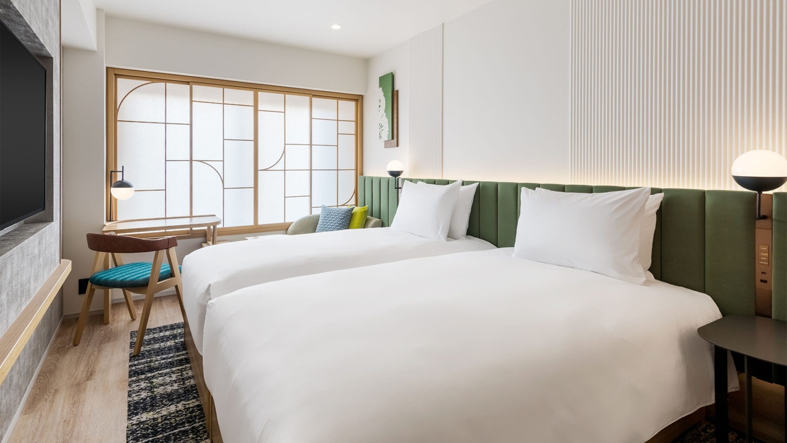 和を取り入れた”京都”を感じるお部屋に、シモンズ社製ベッドで上質な眠りをご提供致します。