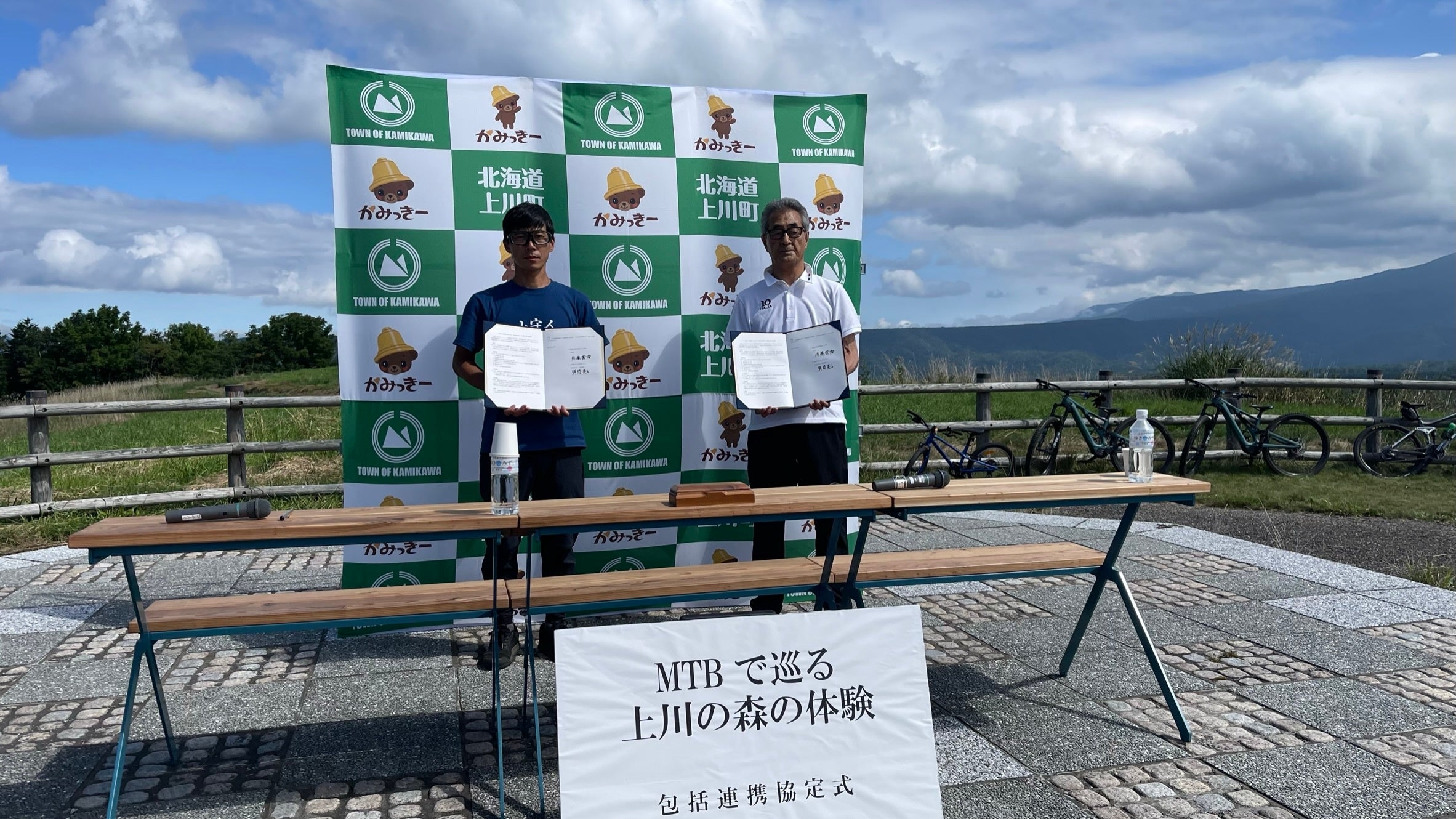 「MTBで巡る上川の森の体験」包括連携協定の協定書に署名をし記念撮影をする、上川町佐藤芳治町長とYAMANASHI MTB 山守人代表の弭間亮。