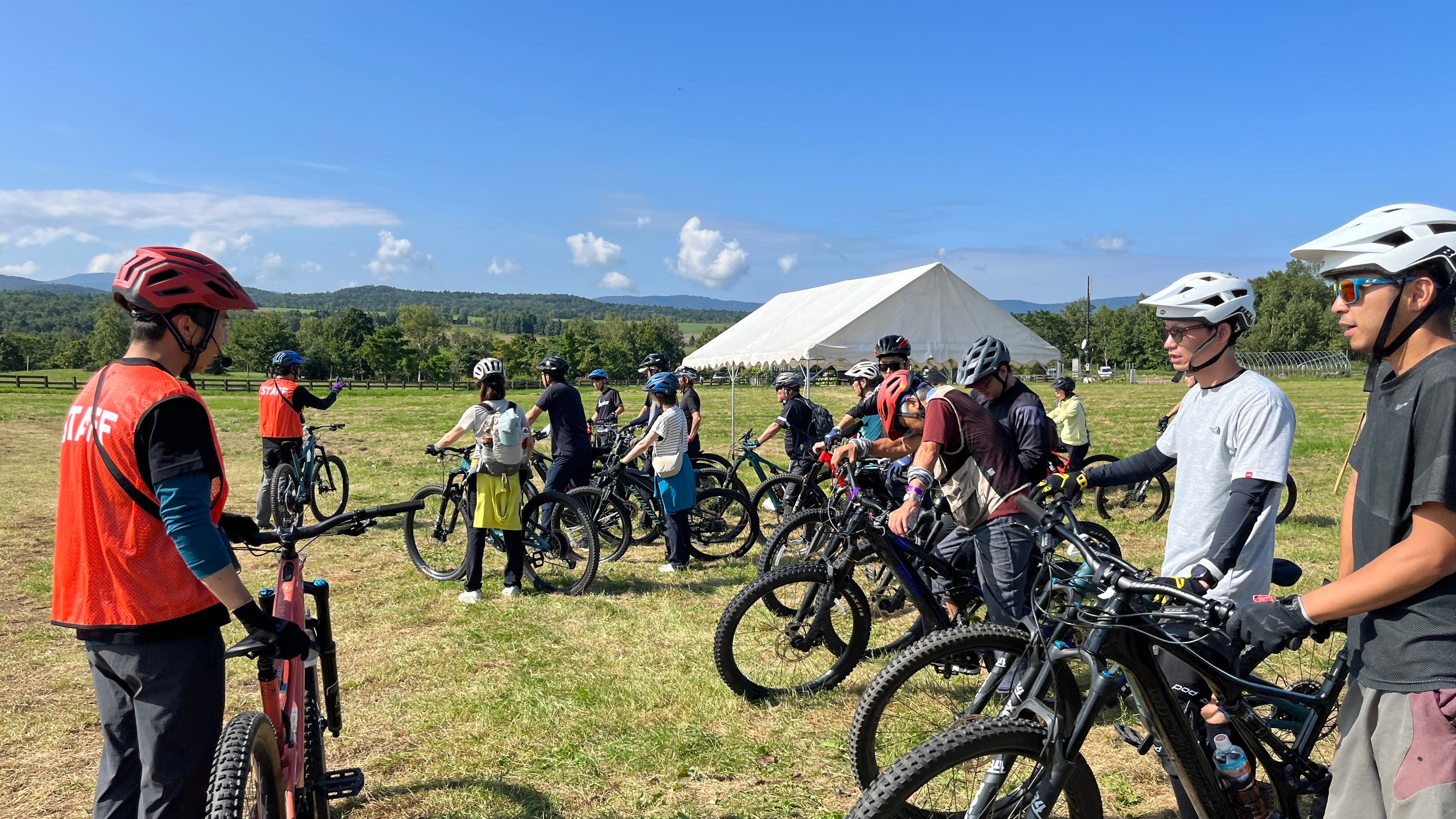 受付を済ませたら、全員がスキル講習を受講します。講師陣は、YAMANASHI MTB 山守人の研修をしっかりと受講しているので、安全に一日マウンテンバイクを楽しむスキルを丁寧にわかりやすく教えてもらえました。