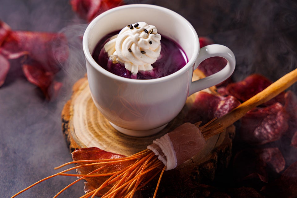 魔女のいたずらにかかったスイーツには、コウモリのチョコレートを砕くと中から煙が漂い、秘密のシロップを注射器で注いで楽しめる“魔女のいたずらパフェ”や魔女をイメージし、見た目はカヌレ、食感はシュー生地のハイブリッドなスイーツ“魔女のシュヌレ”。魔女によって、バターケーキが可愛いキャンディー姿に変えられてしまった“ミイラキャンディ”などが登場。その他、大阪産黒毛和牛「なにわ黒牛」のローストビーフサンドなどのセイボリーや、魔女特製としてメレンゲを浮かべた紫芋の“ポタージュスープ”と、置いて帰ってしまったほうきも合わせて堪能できる、お茶目な魔女のおもてなしもご用意しています。