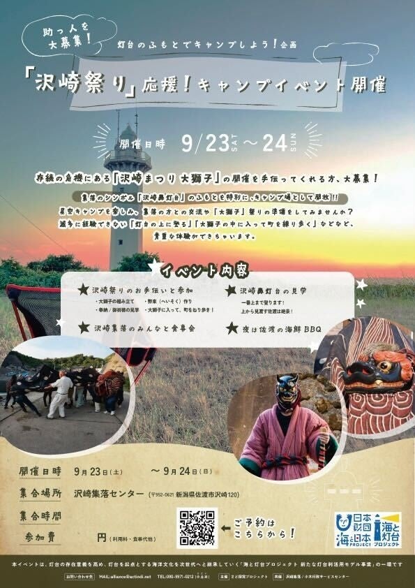 沢崎集落において、海洋文化の香りを色濃く残し歴史と伝統ある「沢崎まつり」開催に際し、沢崎鼻灯台の足元に臨時キャンプサイトを設置します。外部からキャンパーを募り、絶景での灯台キャンプを堪能するとともに「沢崎まつり」の準備・運営など主力の担い手として携わるミッション型のキャンプイベントです。