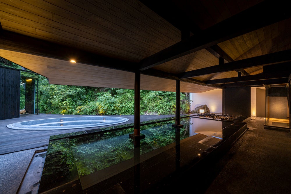 ガラスの壁面からは土の地層が見え、太陽光が差し込み、植物が育つのに必要な要素(光・水・土)を取り込んでいます。水風呂に使用する水は御船山の天然水。水深は浅く、横になった状態で入浴するスタイルです。