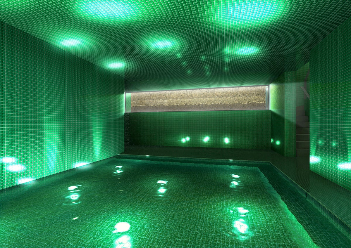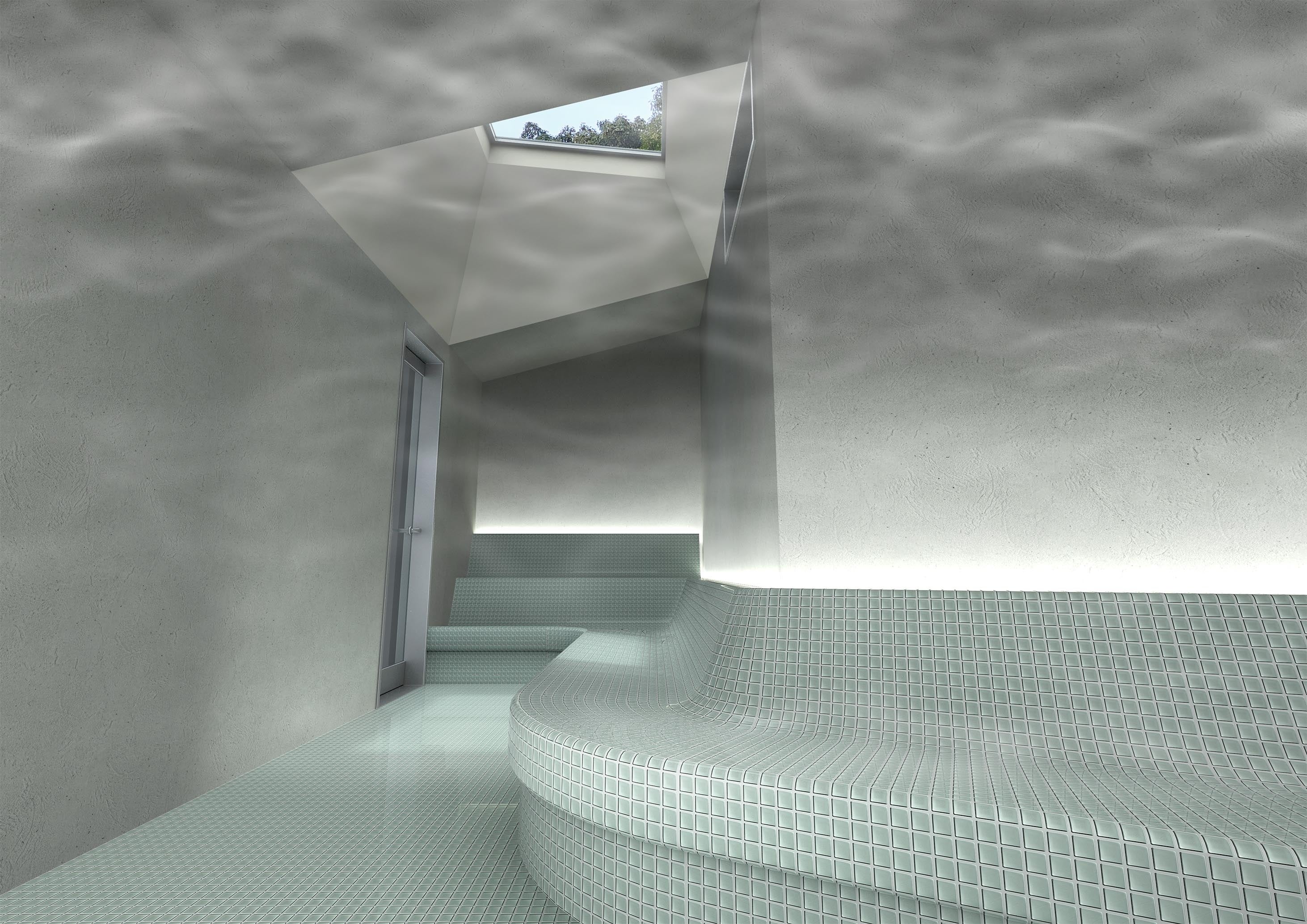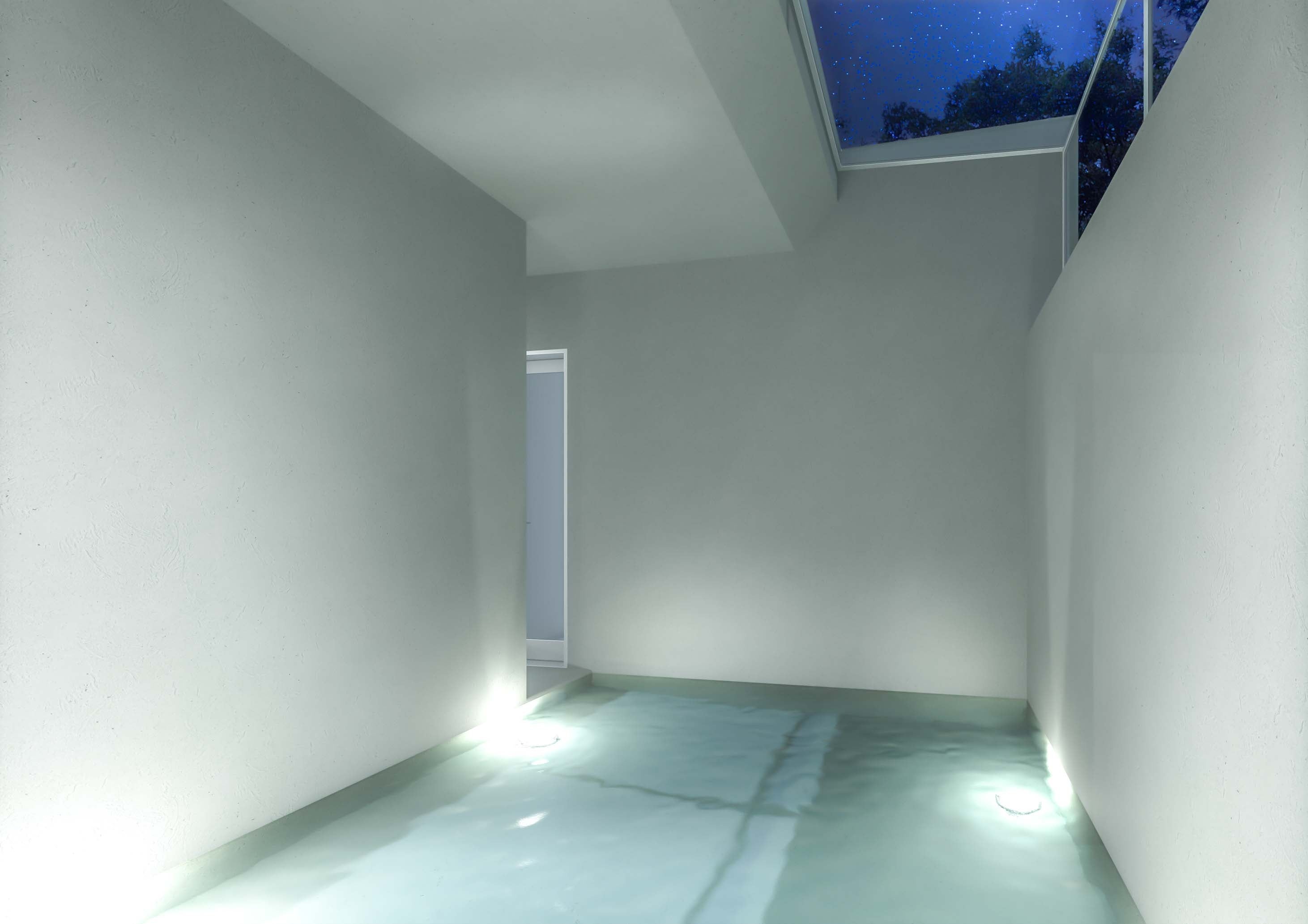 新たに新設する水風呂は薬草スチームサウナに隣接し、薬草の色を模した地下空間。