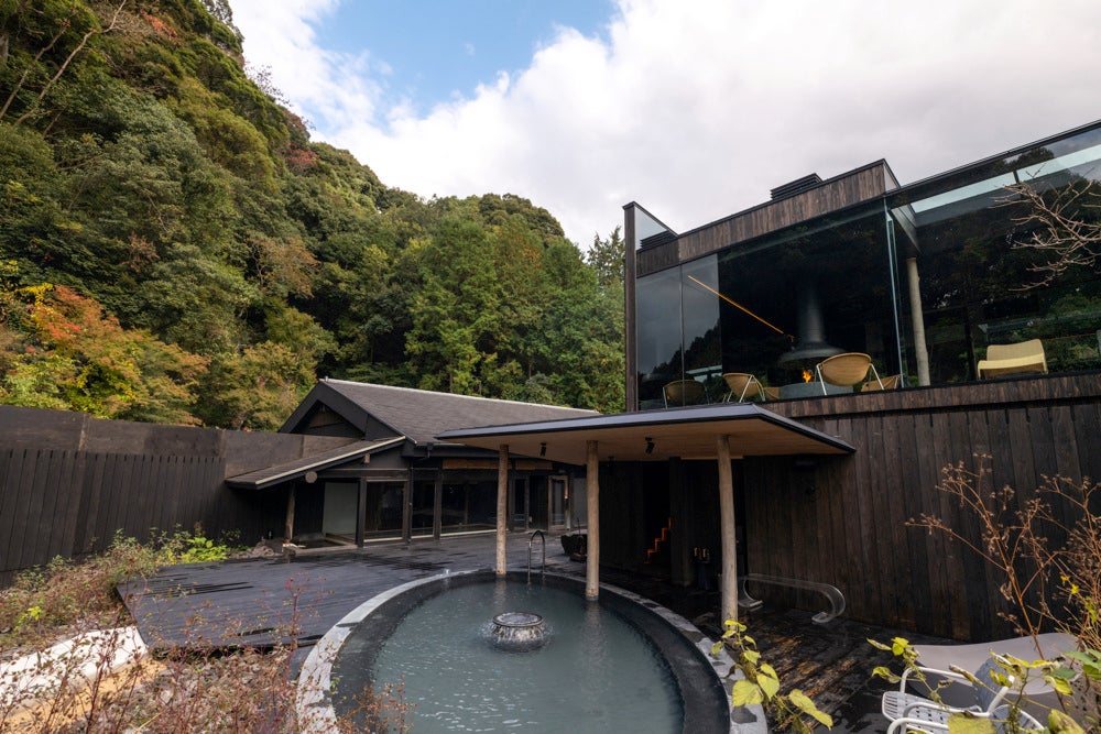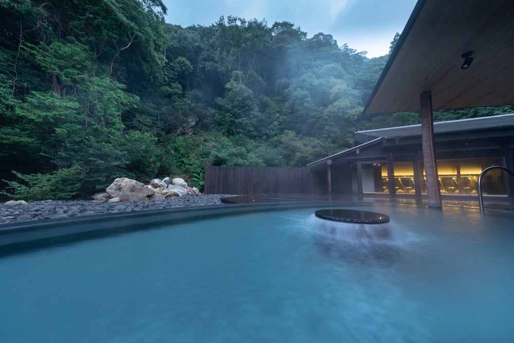 サウナ用に焙煎・抽出したオリジナルの佐賀県嬉野市産ほうじ茶と、御船山の天然水を使ったセルフロウリュが楽しめるドライサウナをはじめ、御船山の自然を愛でながらの外気浴スペース、武雄温泉の源泉を冷却した水風呂や露天風呂、内湯などを設けています。