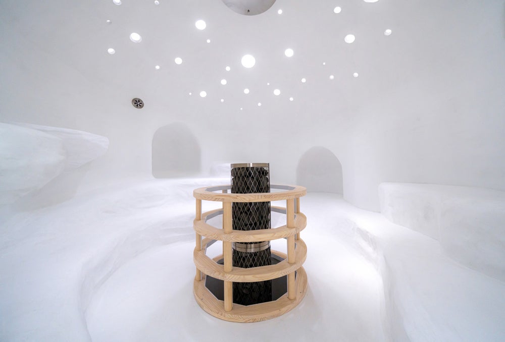 薬草の蒸気と壁面から差し込む太陽光、夜は最小限のライティングで幻想的な空間を演出します。