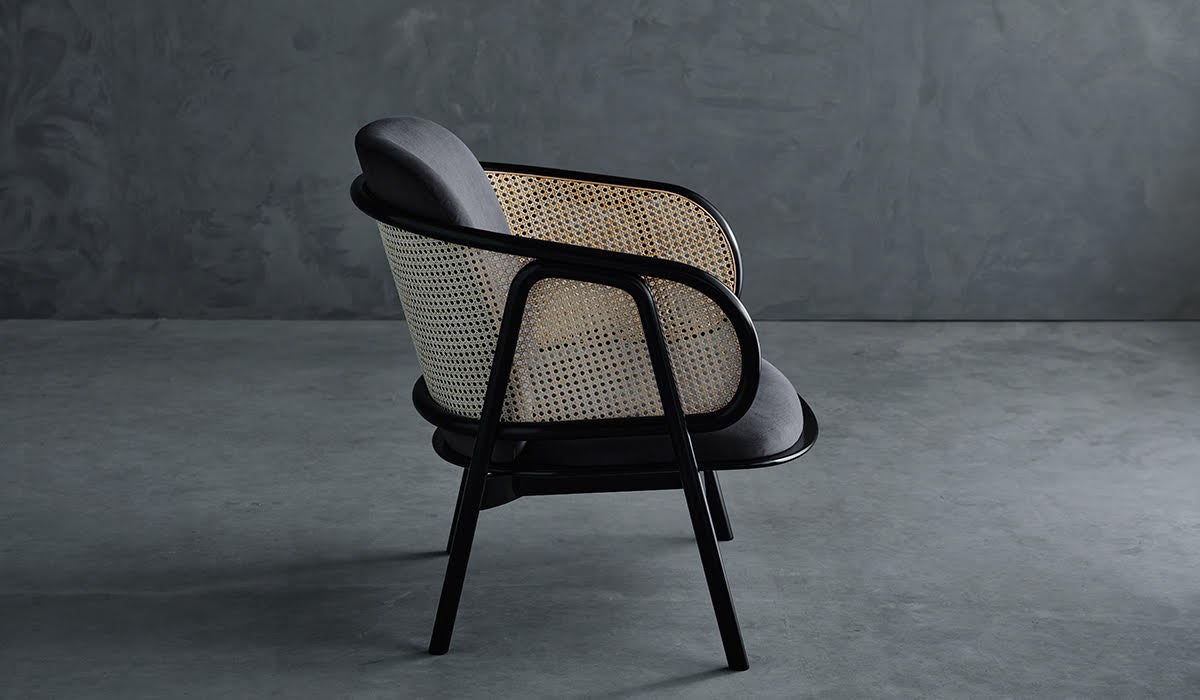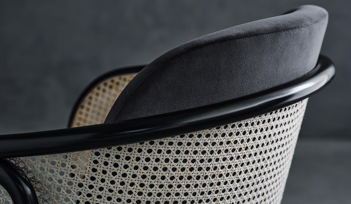 肘から背裏にかけてラウンドした部分のマテリアルは、ファブリックかカゴメ編みのラタンから選択することができます。