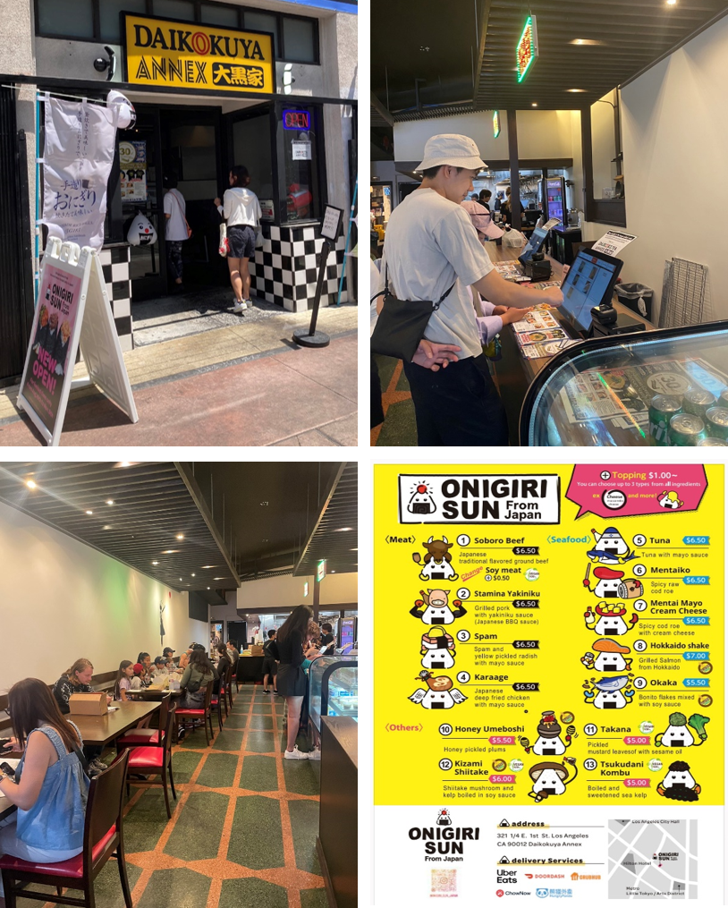 その第一歩として具体的には本年8月10日(木)(*アメリカ現地時間)より期間限定店舗「ONIGIRI SUN」をアメリカ・ロサンゼルスにオープンしました。これは昨年2022年9月同地において、キッチンカーによるおにぎりのテスト販売を実施し、握りたてのおにぎりが現地で大変好評だった事を受けて行うものです。なお、当社が飲食業へ参入するに際し、店舗・運営面などの多岐にわたり、アメリカ・ロサンゼルスにおいて日本食フードビジネスを数多く手掛ける毘沙門グループ(ラーメン大黒家ANNEX)のご協力をいただいています。