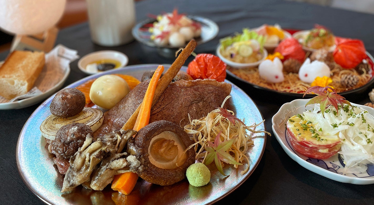 メインは贅沢に、国産牛を用いた柔らかな「サーロインステーキ」。しっかりとしたボリュームの300gでご提供いたします。また、人参やキノコ、ゴボウやカボチャなど、ダイナミックに素揚げした“秋色”の野菜は、お肉とともにお楽しみください。見てほっこり、食べて満足。「中秋の名月」にぴったりの秋グルメで、充実のディナータイムをお楽しみください。