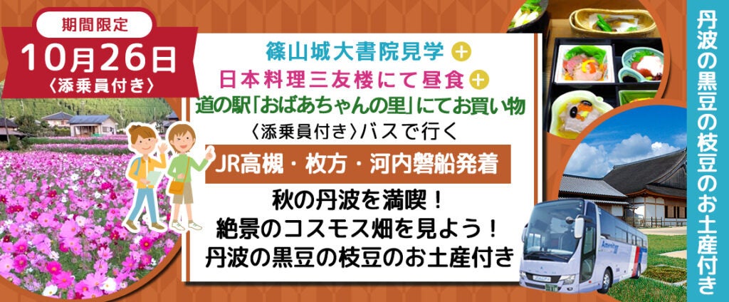 ※新商品※《丹波の黒豆お土産付き》10月26日(木) 【兵庫県・丹波】〈JR高槻・京阪枚方・JR河内磐船発着・添乗員付き〉 コスモス畑+篠山城大書院散策+ご昼食をご堪能+地元の農作物を買いに行こう 丹波の秋を感じる日帰りバスプラン