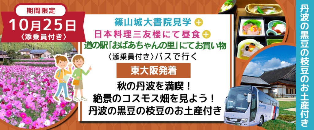 ※新商品※《丹波の黒豆お土産付き》10月25日(水) 【兵庫県・丹波】〈東大阪発着・添乗員付き〉 コスモス畑+篠山城大書院散策+ご昼食をご堪能+地元の農作物を買いに行こう 丹波の秋を感じる日帰りバスプラン