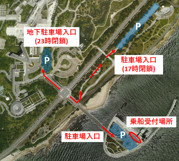 「海岸南駐車場(17時閉鎖)」「夢舞台地下駐車場(23時閉鎖)」を、津名港は「津名港ターミナル駐車場」をご利用ください。
