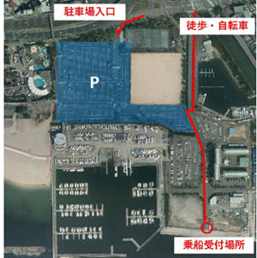 ・お車で来場される場合、須磨側は「須磨海浜公園第一駐車場」を、あわじ交流の翼港は「翼港内駐車場」