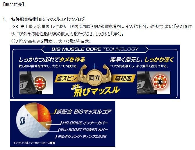 同商品は、国内男子・女子ツアーで多くのプロが使用している『TOUR B X/XS』※1のラインアップの中でも人気の、コーポレートカラー「Bマーク」を、『TOUR B JGR』では初めて採用したモデルになります。タイヤやモータースポーツでも お馴染みの「Bマーク」が入った新しいデザインの『TOUR B JGR』で、「デカ飛びマッスル」をご体感ください。