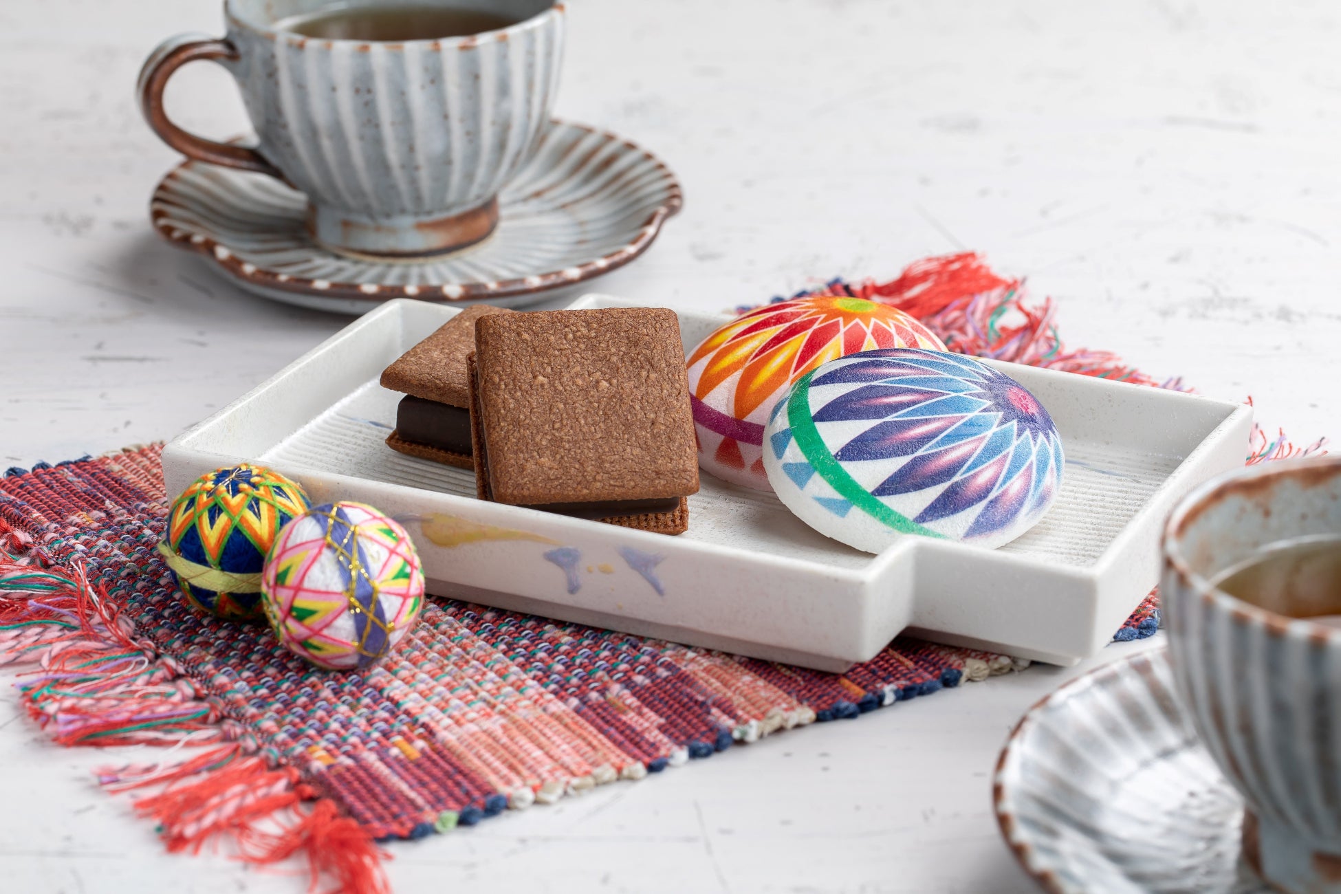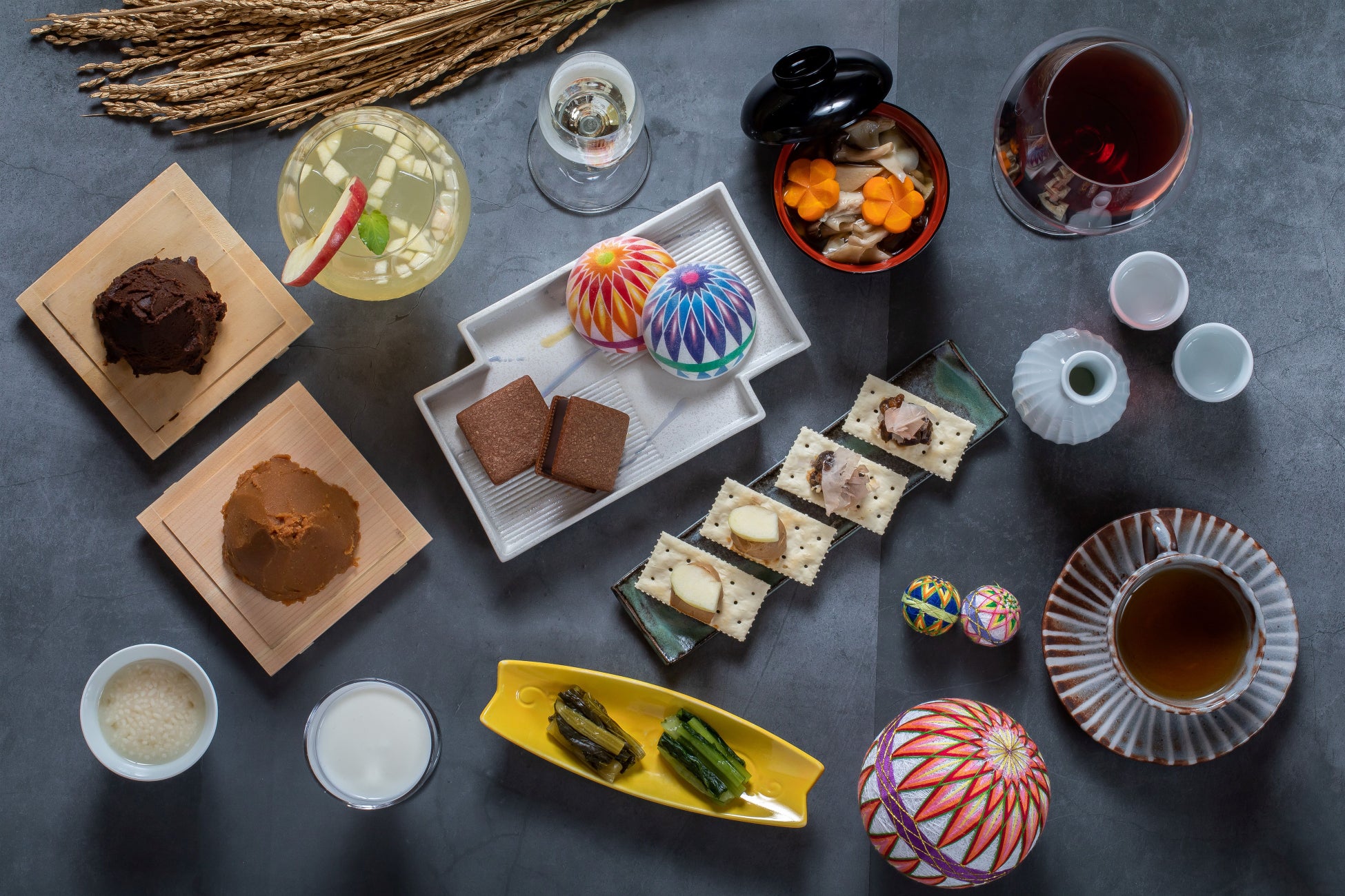 信州の厳しい寒さを和らげるような、発酵を取り入れたウェルカムスイーツとドリンクをチェックイン時に用意します。ウェルカムスイーツには松本の伝統工芸品である松本手まりをイメージした味噌モナランタンと、濃厚な味わいが特徴のチョコレートサンドを用意。到着時に糖分を含んだスイーツをとることで、旅の疲れで血糖値の下がった状態での入浴時の立ち眩みなどを防ぐ効果があります。同じく発酵食品である紅茶とともに入浴前のほっと一息つく時間を過ごせます。