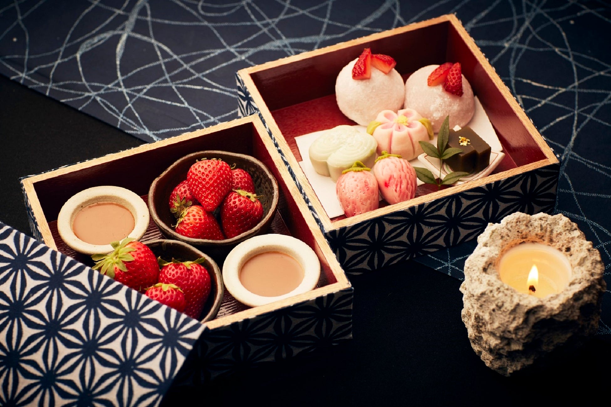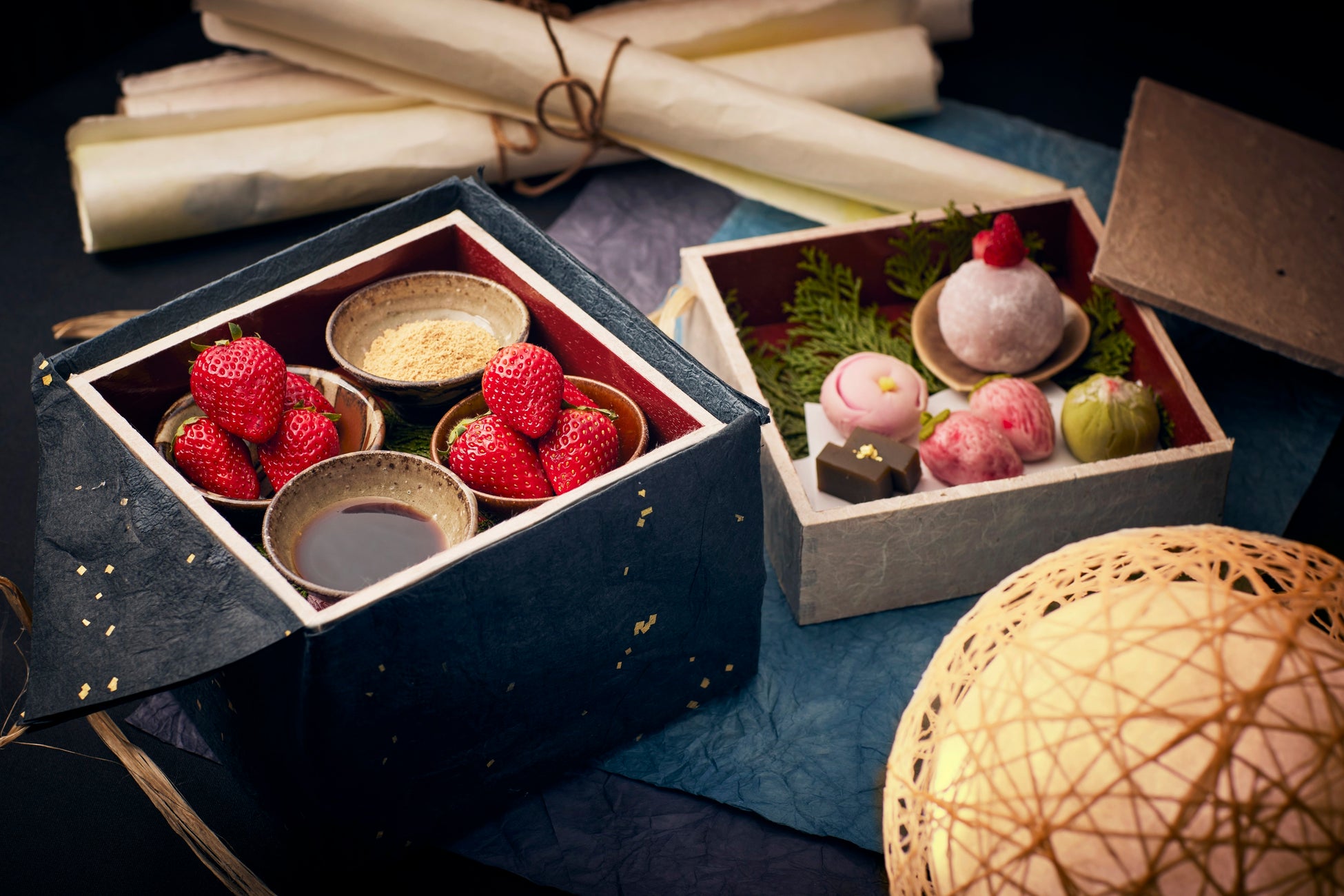 夜に「いちごのお夜食」を提供します。お重には栃木うまれのいちご2種類や、日光東照宮近くにある創業約100年の「菓匠おしやま」の和菓子が詰まっています。いちごモチーフの上生菓子やとちおとめと生クリームが詰まったいちご大福が入っており、味だけではなく見た目でもお重を堪能できます。また、いちごには施設ごとに異なるコンディメントを用意します。コンディメントは日光の特産品やそれぞれの施設が選定したこだわりの内容です。夕食後の夜の時間に甘いいちごと和菓子の詰まったお重を大切な人と囲むことで、特別な夜の時間を過ごせます。