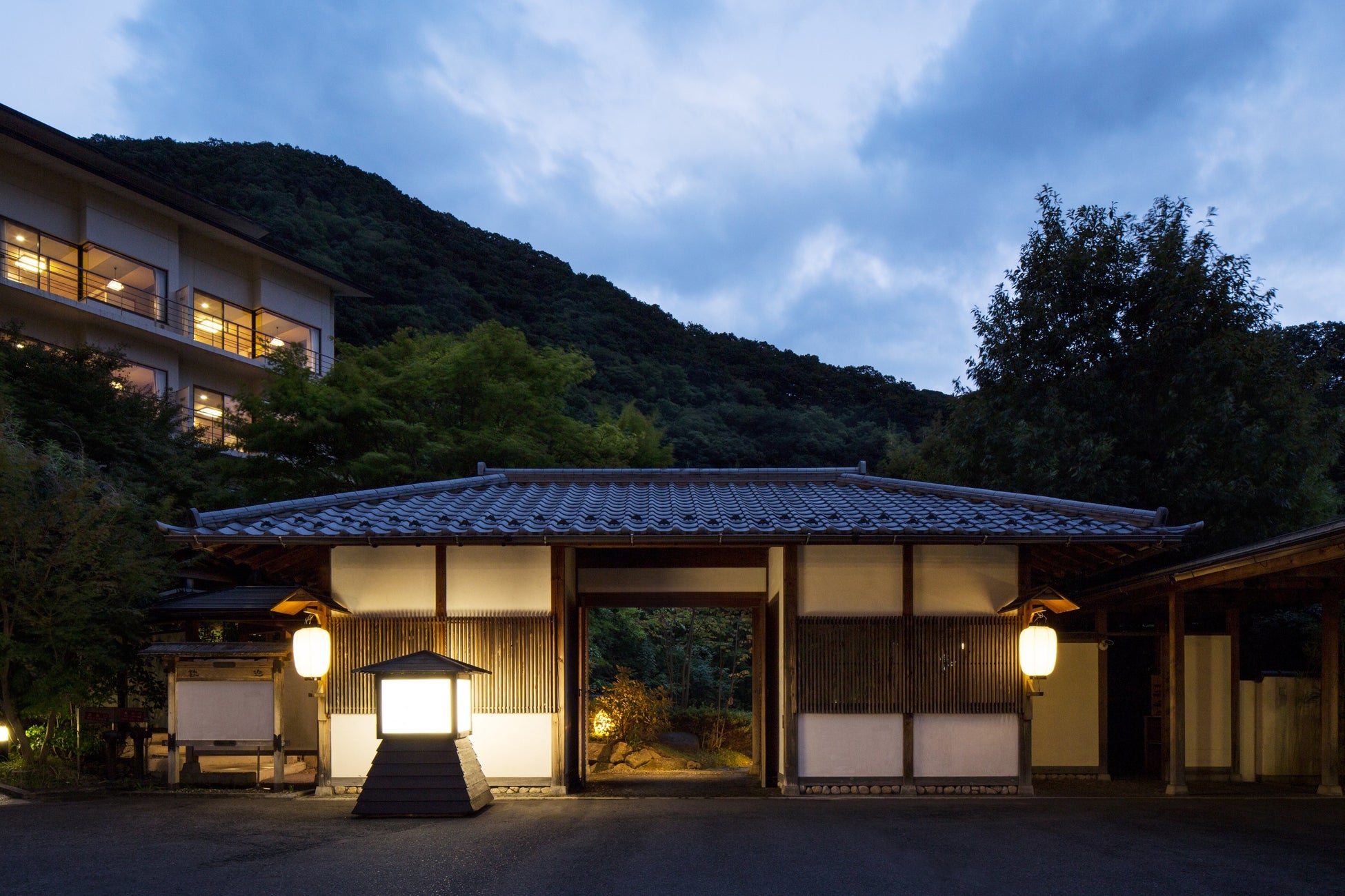 鬼怒川の渓流に面した小高い丘の上に位置する温泉旅館。益子焼や黒羽藍染、大谷石などが館内に散りばめられ、木々に囲まれた中庭や客室からは四季の景色が望めます。