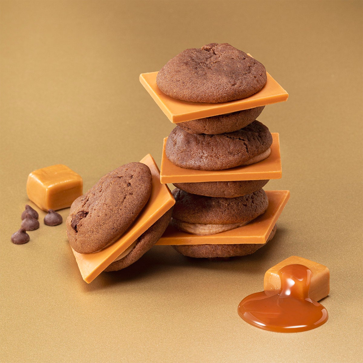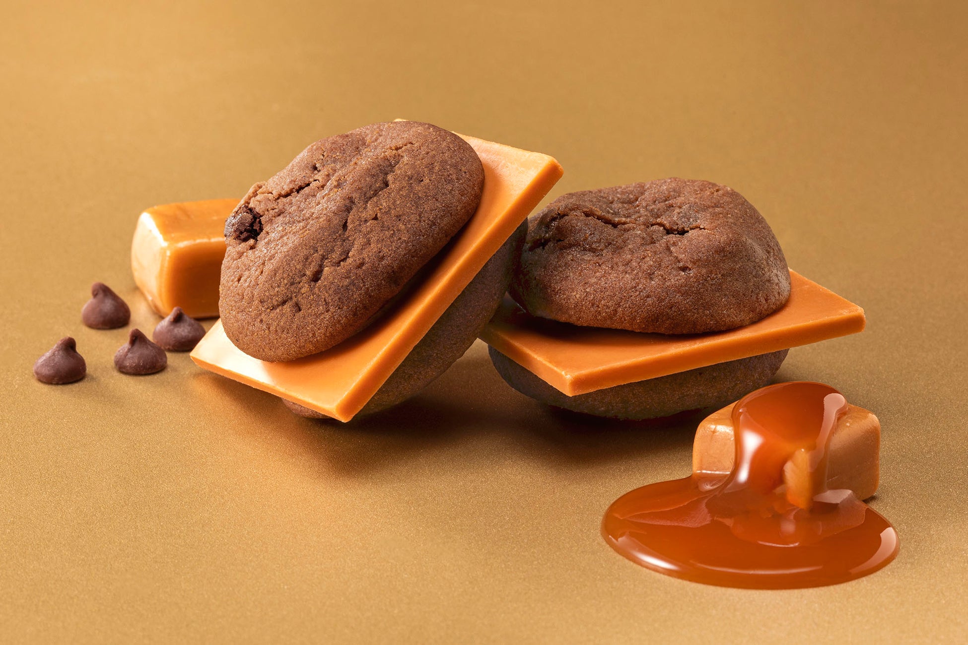 しっとりやわらかな“ココアソフトクッキー”に、キャプテンスイーツバーガー史上で初めて“チョコチップ”を練り込みました。間には、はみ出るほど大きな“キャラメルショコラ”と、くちどけなめらかな“キャラメルホイップショコラ”のWキャラメルをサンド。ひとくちかぶりつくと、ほんのりビターなソフトクッキーの間から、キャラメルのコクと甘みがとろ~り!チョコチップの新食感と優しい甘みが口いっぱいに広がる、グルメなスイーツバーガーです。