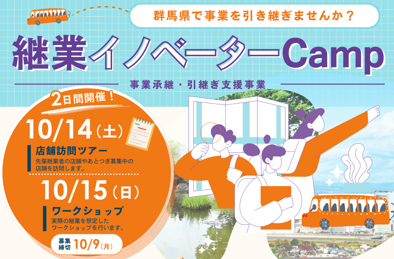 群馬県は、若手人材等に継業の魅力を訴求し、多様な担い手(継業イノベーター)の参入を促進するため、「継業イノベーターCamp」を今年度、初めて実施します。10/14(土)は先輩継業者の店舗やあとつぎ募集中の店舗を訪問し、10/15(日)は実際の継業を想定したワークショップを行いますので、群馬県内での起業や継業をお考えの方はぜひともご参加ください。