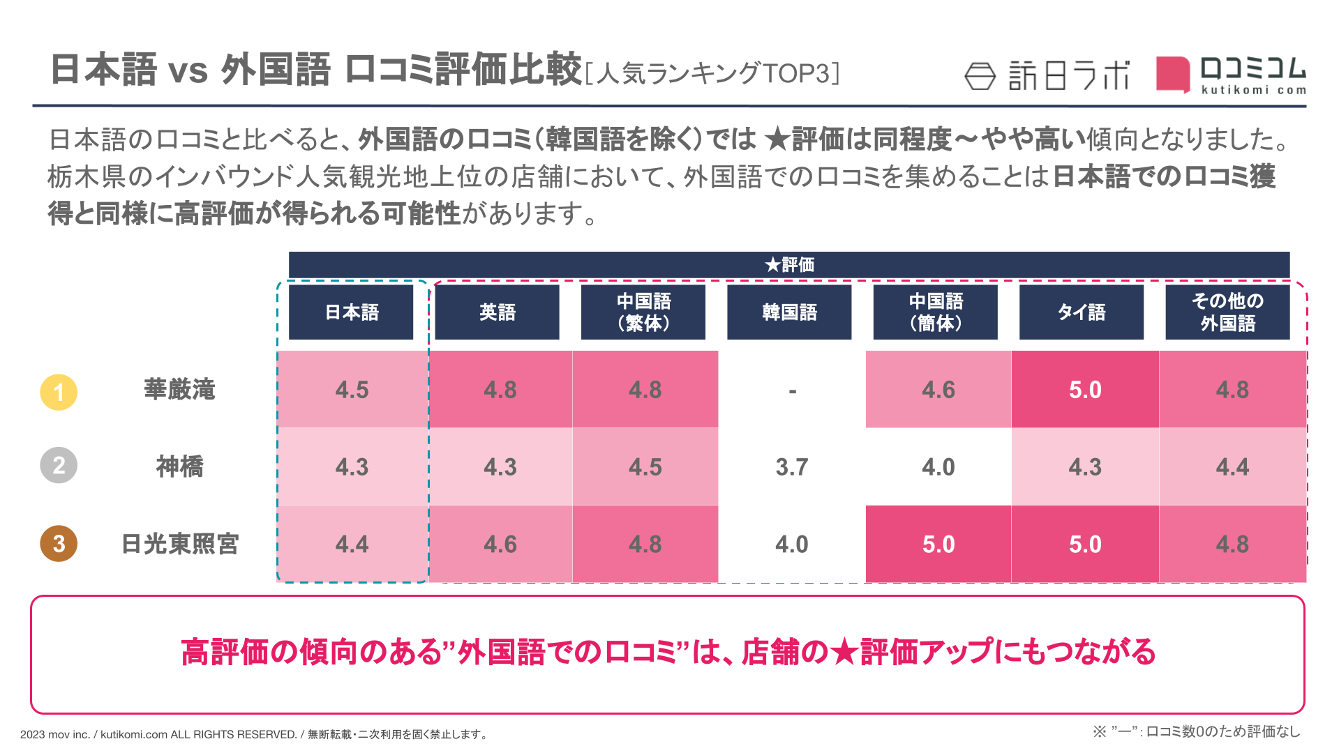 日本語の口コミと比べると、外国語の口コミ(韓国語を除く)では ★評価は同程度〜やや高い傾向となりました。栃木県のインバウンド人気観光地上位の店舗において、外国語での口コミを集めることは日本語での口コミ獲得と同様に高評価が得られる可能性があります。