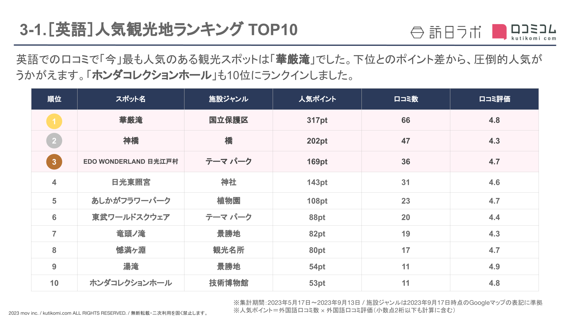英語での口コミで「今」最も人気のある観光スポットは「華厳滝」でした。下位とのポイント差から、圧倒的人気がうかがえます。「ホンダコレクションホール」も10位にランクインしました。