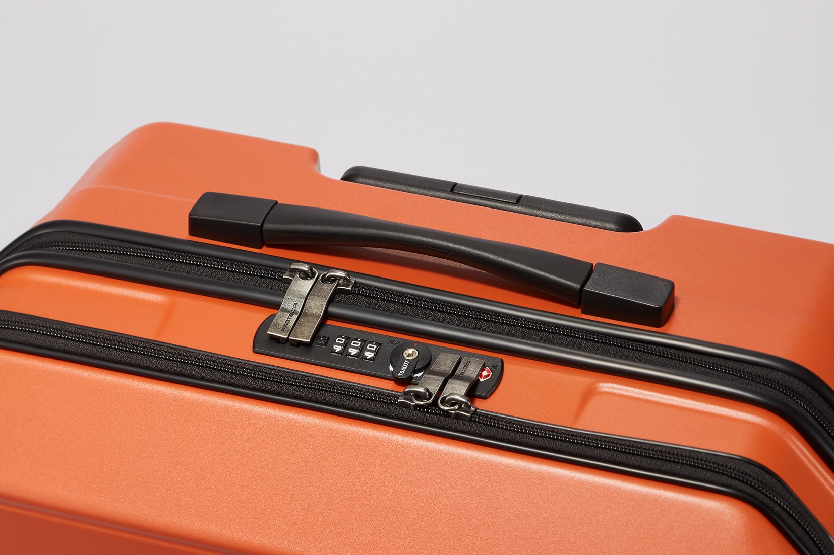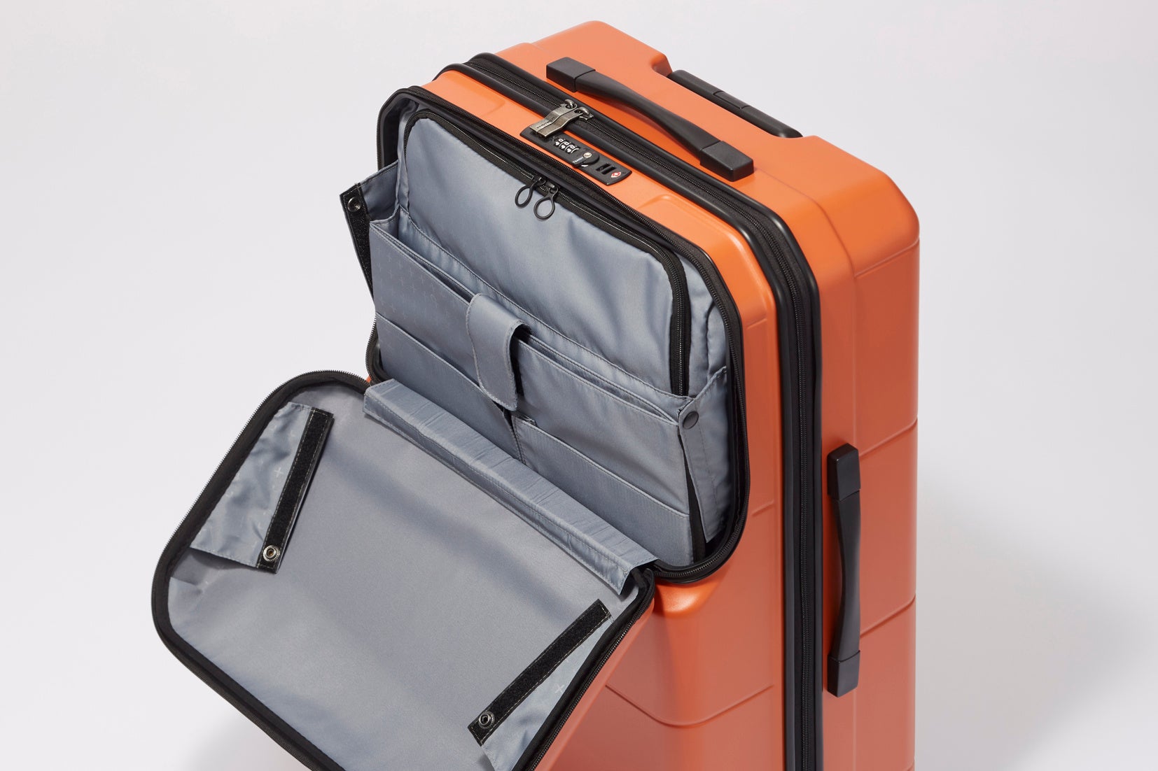 スーツケースを立てた状態で開け閉めできる、開口部が大きく開くフロントポケット。中でもキャビンサイズは最も大きなフロントポケットを備えています。