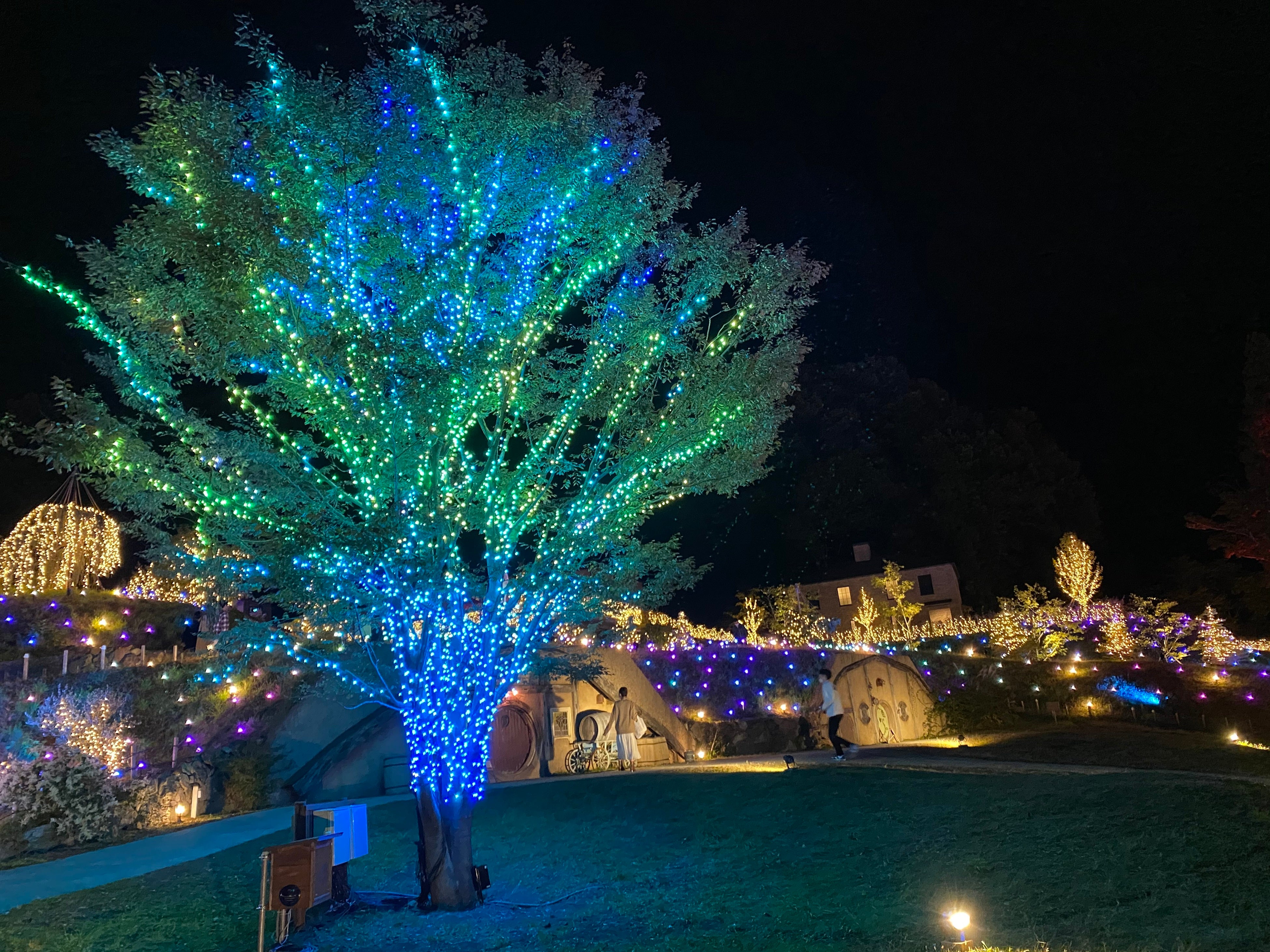 温もりのある〝妖精たちの光の庭〟が丘の上に広がります。人気のイルミネーションの体験スポット「奇跡の青いバラ」や「七色に輝く祈りの木」では、点灯体験がお楽しみいただけます。