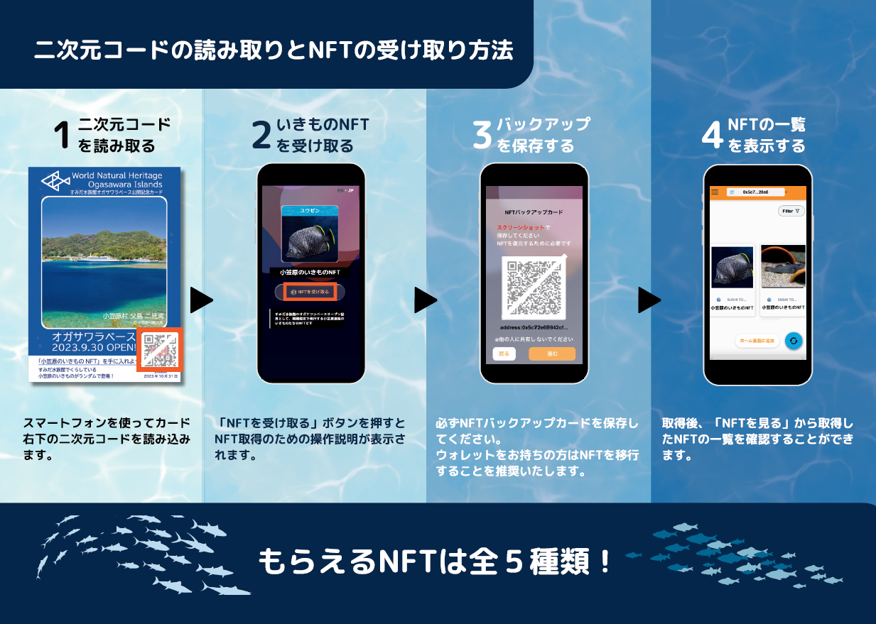 配布される記念カードには、二次元コードが印字されており、それをスマートフォンで読み取ることで、「オガサワラベース」や小笠原大水槽の生き物を撮影して制作された全5種類の「小笠原のいきものNFT」(以下、「いきものNFT」)から1つがランダムに発行されます。5種類の生き物は「シロワニ」「ミナミイスズミ」「アオウミガメ」「ユウゼン」「オガサワラヨシノボリ」で、記念カードはイベント期間中に合計20,000枚配布される予定です。(なくなり次第終了いたします)