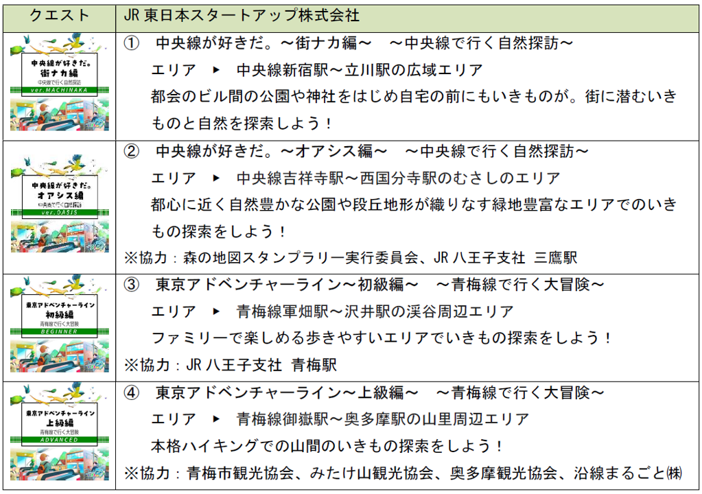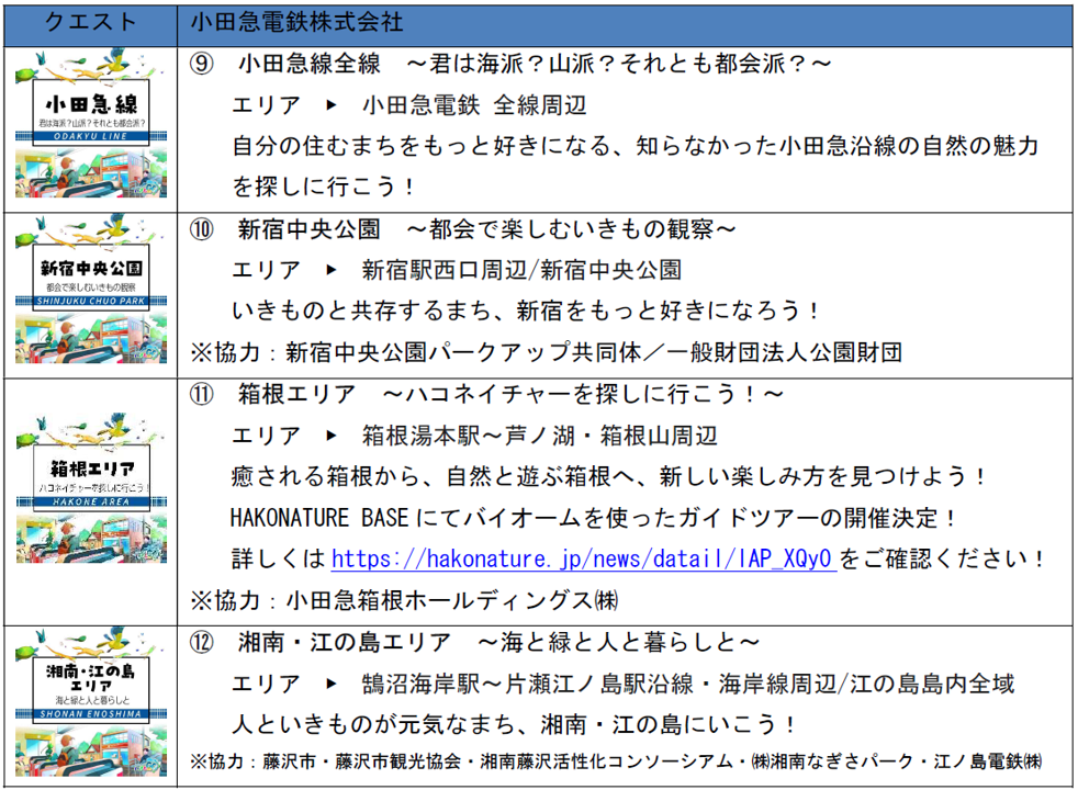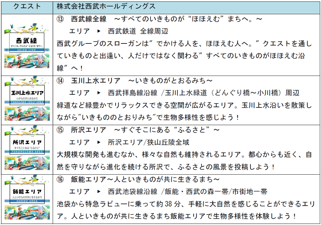 「駅からはじまるいきもの探し いきものGO」の開催期間中に配信されるクエスト一覧は下記の通りです。