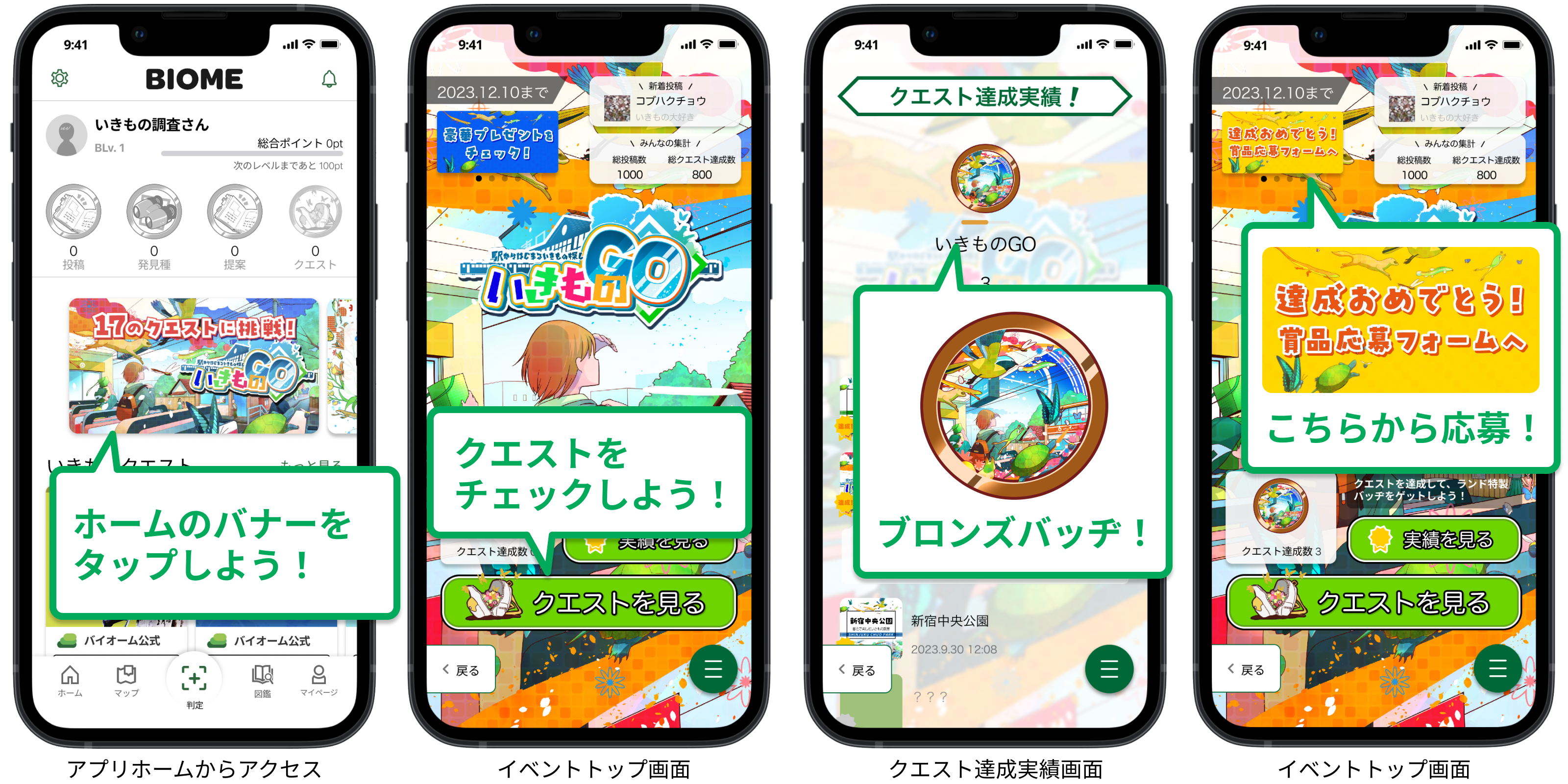(※)「クエスト」は、Biomeに実装されている独自のゲーム機能で、テーマに沿って選定された対象の生物種を見つけ、写真を撮影・投稿することでクリアできます。