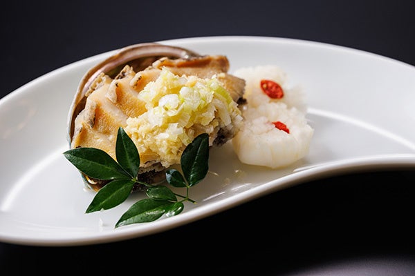 蝦夷鮑蒸し 葱生姜ソース/鶏肉の野菜巻き煮 くるみの飴炊き/ツブ貝のXO醤炒め/ダックロース/