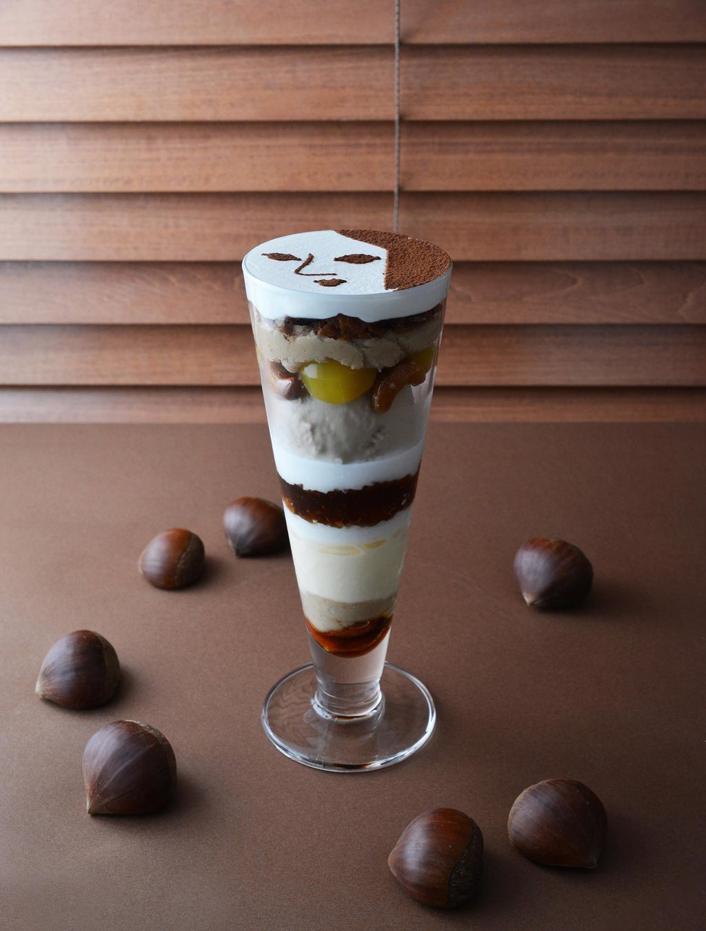 ゴロゴロ入った食べ応えばつぐんな栗の甘露煮、キャラメルナッツのカリッと香ばしいアクセント、渋皮栗アイス、メープルゼリーなど、ひとくちごとに変化する味と食感をお楽しみください。