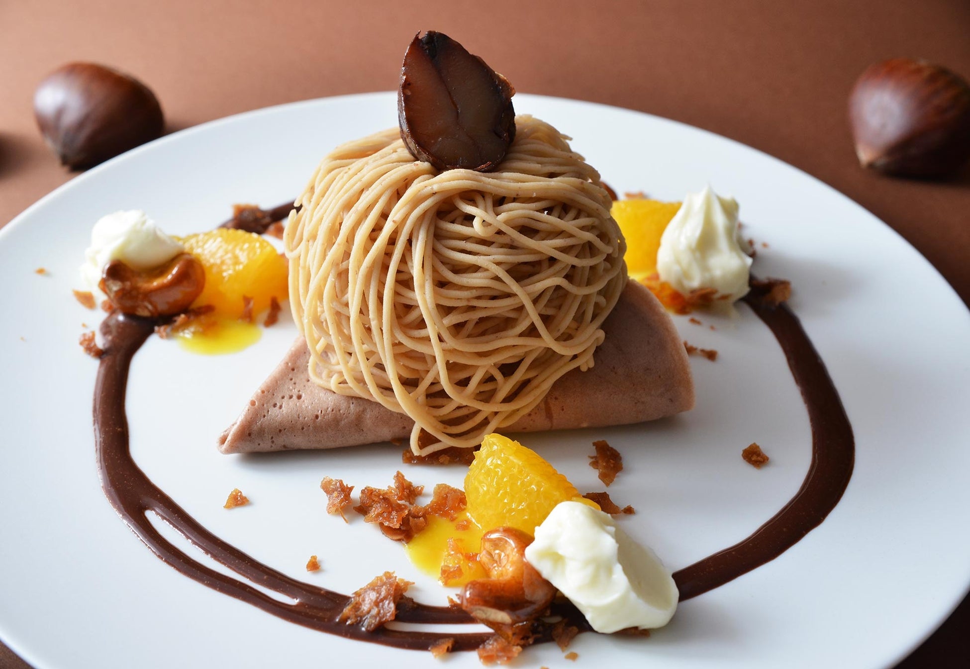 クレープ生地の上に濃厚和栗ペーストをたっぷりと。まわりには、チーズクリーム、オレンジのマリネ、キャラメルナッツなど、味と食感のアクセントを散りばめました。
