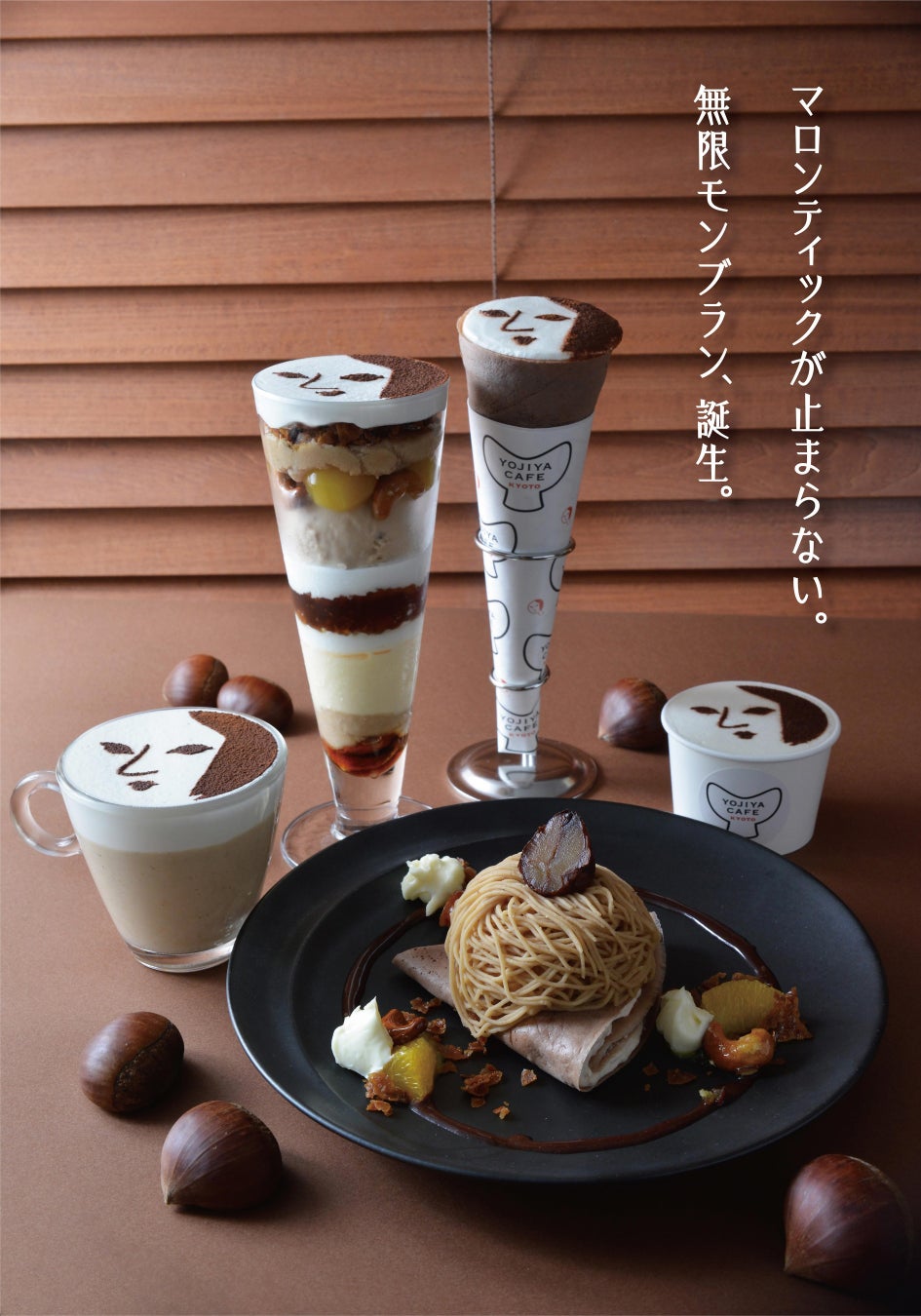 よーじやカフェでは、夏にはメディアで多く取り上げられた「スースー!チョコミント」、春にはかわいらしい見た目の「いちごスイーツ」など、京都の四季にあわせて、さまざまな味わいをお楽しみいただけるスイーツを提供してまいりました。今秋は、昨年大変ご好評いただいた栗スイーツを、趣向を変えて5種類ご用意。「無限モンブラン」をはじめ、「栗×メープル」のパフェやクレープ、カップスイーツ、カプチーノなどすべて新作ぞろいです。