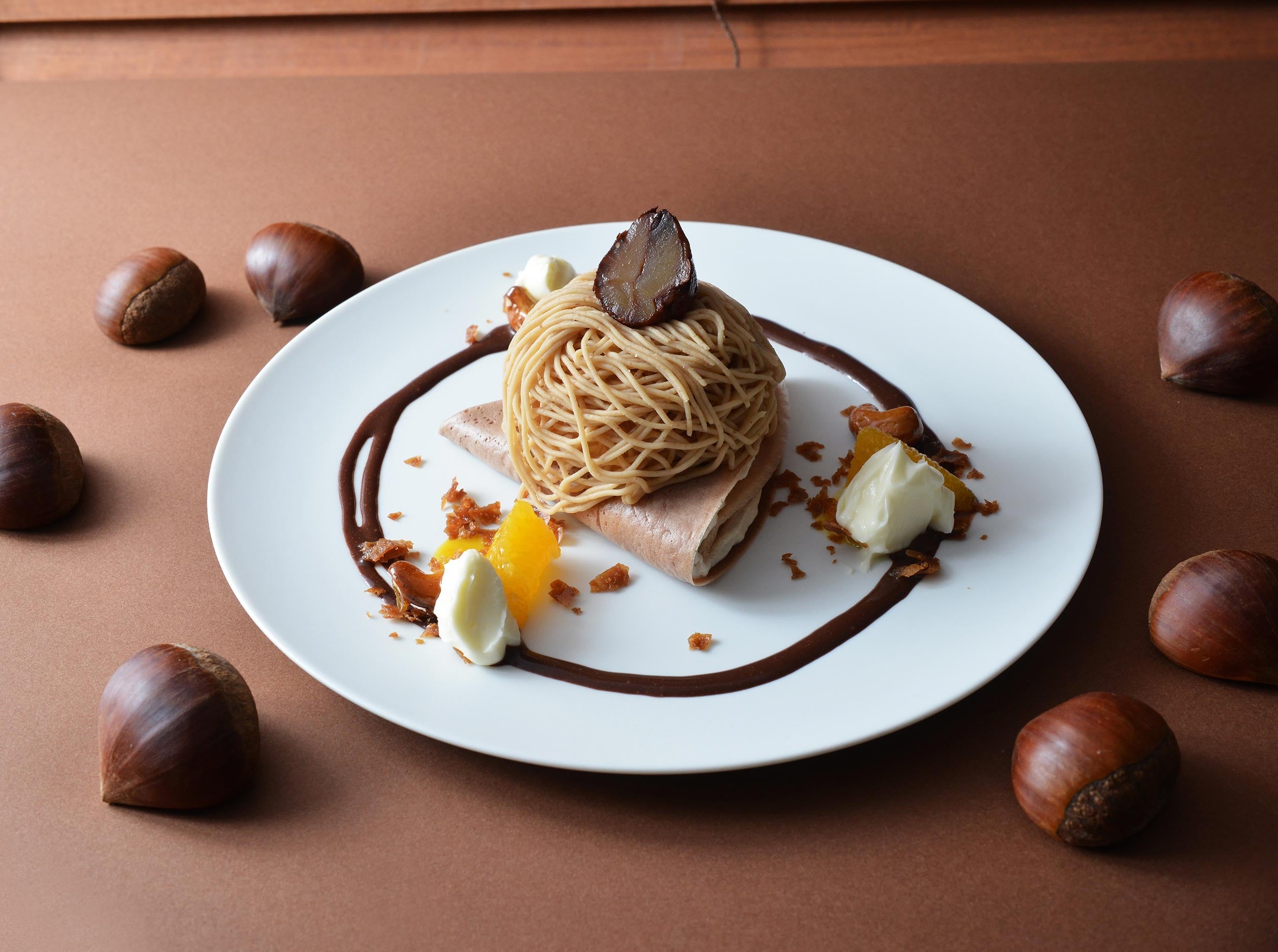 クレープ生地の上に濃厚和栗ペーストをたっぷりと。まわりには、チーズクリーム、オレンジのマリネ、キャラメルナッツなど、味と食感のアクセントを散りばめました。