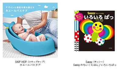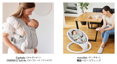 新生児期から使用できる電動ベビースウィングや抱っこ紐、各種バスアイテム、などを設置。