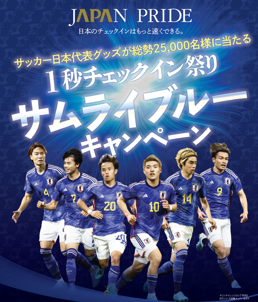 「サムライブルーキャンペーン」は、「アパ直」経由で予約・宿泊、アパアプリで1秒チェックインしたお客様が対象で、1秒チェックイン機から『サムライブルーカードキー』が出たら大当たり!サッカー日本代表グッズ「A賞 アディダス サッカー日本代表2022ホーム レプリカユニフォーム S/S※アパホテルロゴ入り(250名様)」「B賞 アパホテルオリジナルマフラータオル(24,750名様)」を総勢25,000名様にプレゼントします。キャンペーン期間は、2023年10月1日(日)から2023年12月31日(日)までの3か月間、アパホテル全館で毎日開催します。