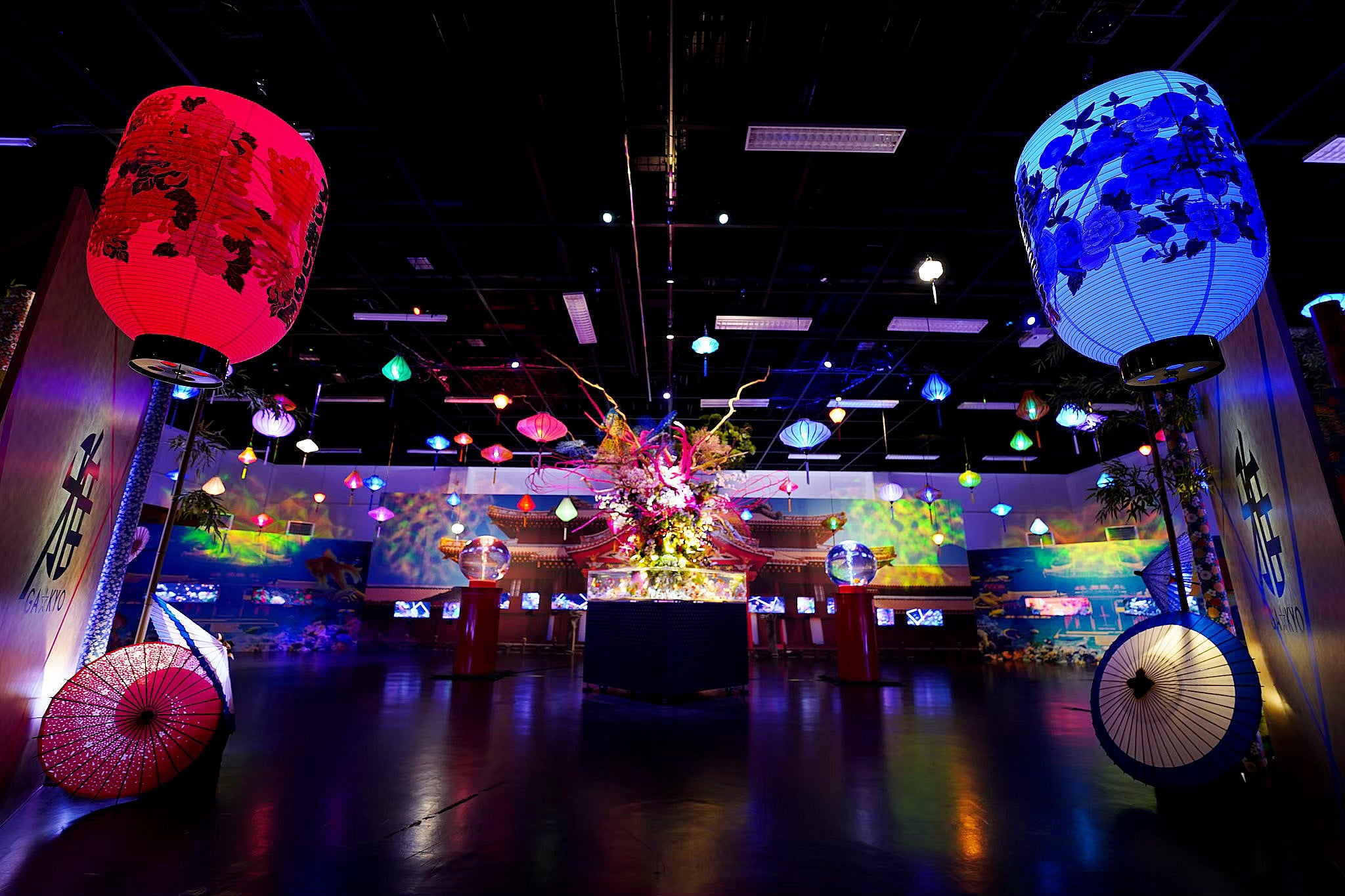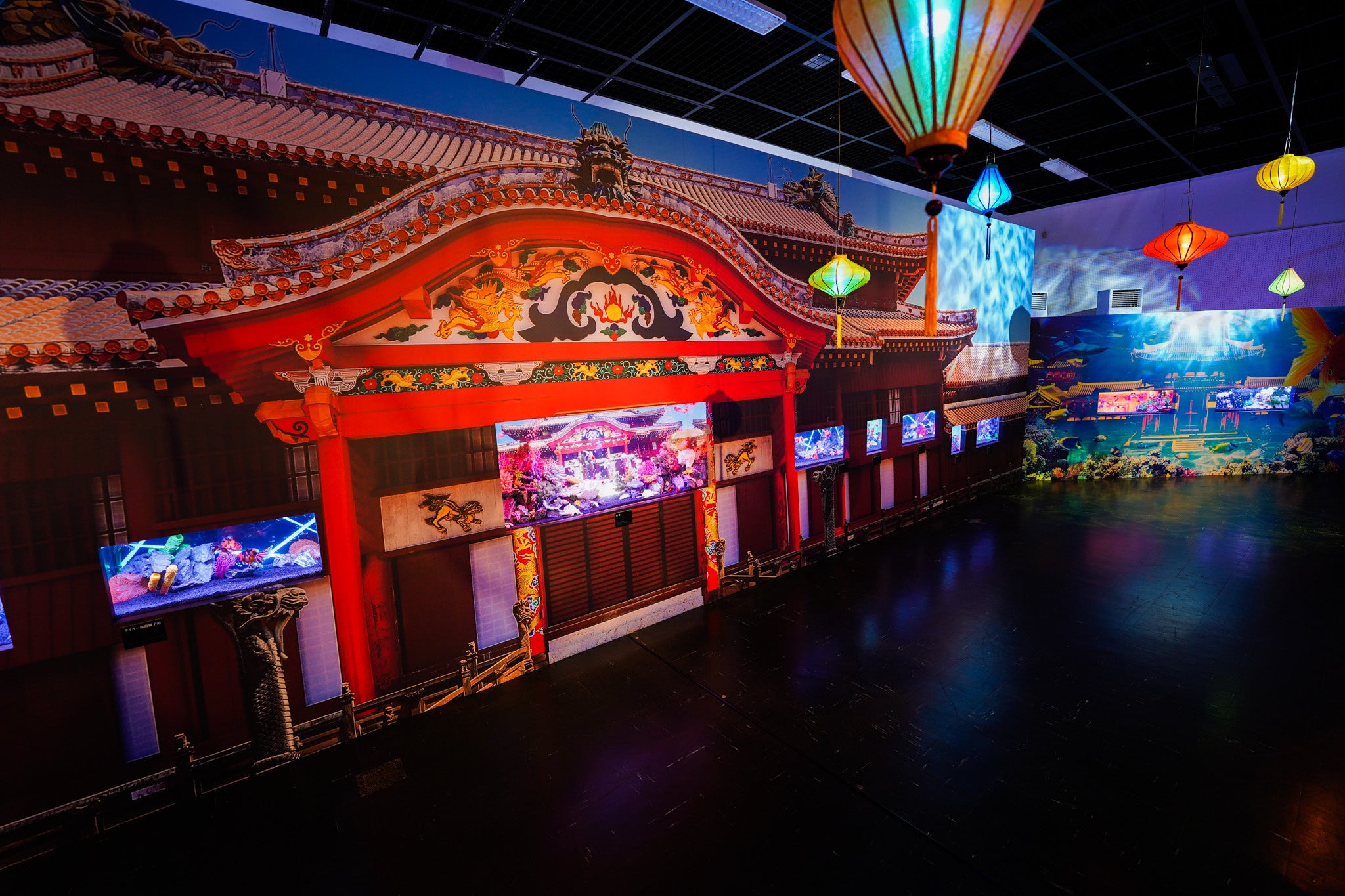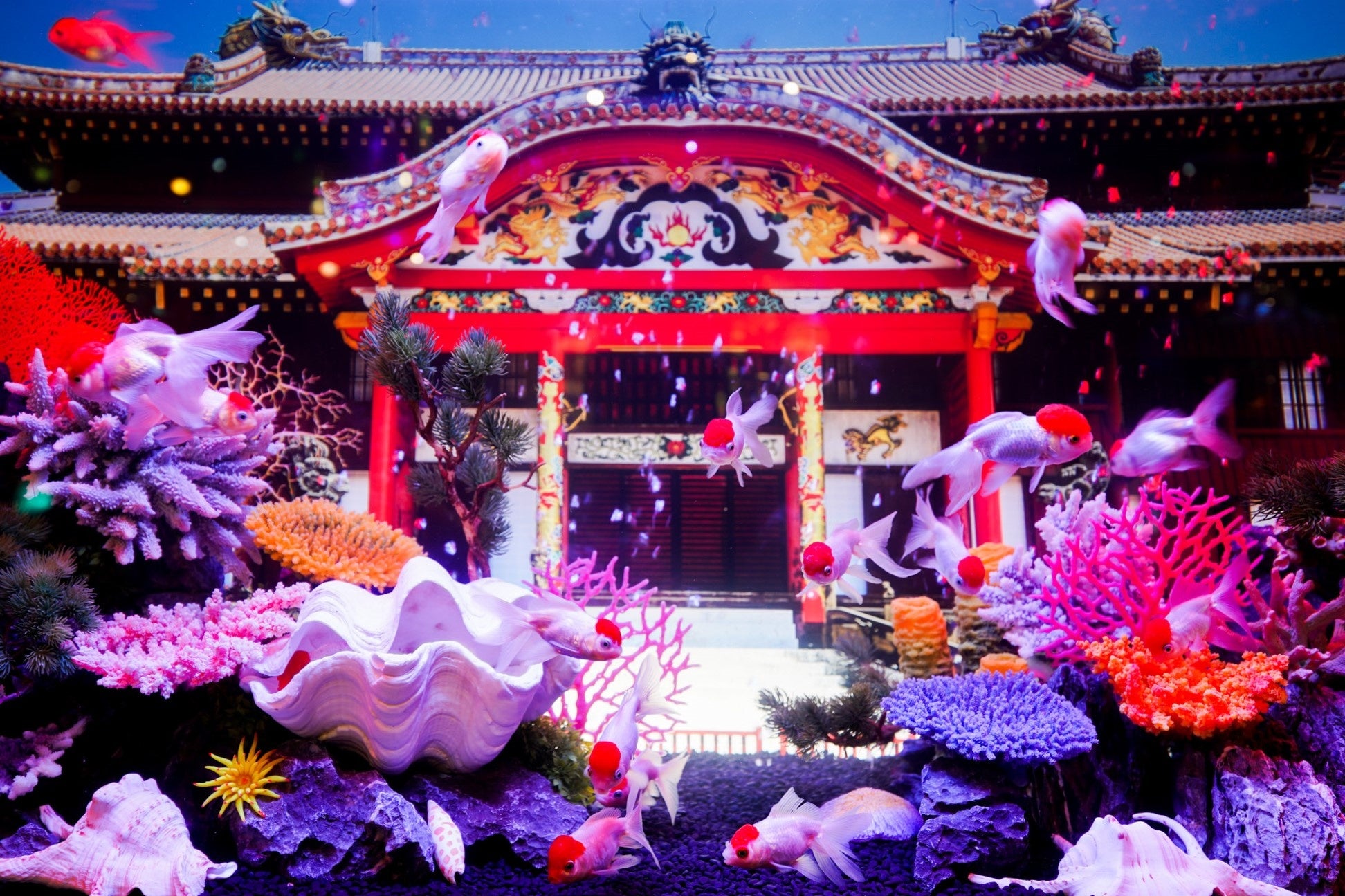展示エリアでは、「琉球紅型写真」「琉球紅型写真」「雅 琉球竜宮盆栽」「琉球金魚伝説」の4つのゾーンを、沖縄を代表する「首里城」や「琉球紅型」を用いてコラボレーションした空間を演出しています。
