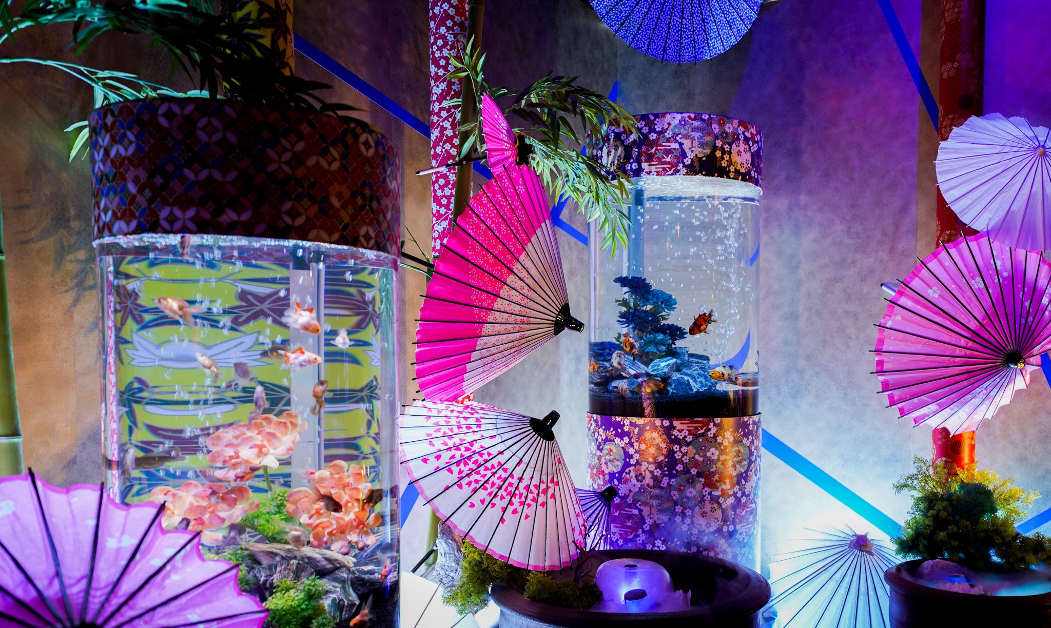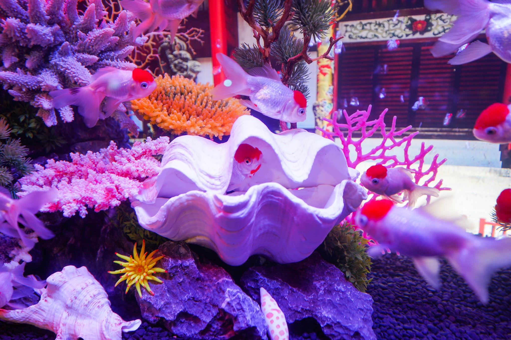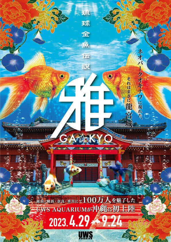 日本の伝統・伝説×アクアリウム のアート施設「UWS AQUARIUM GA☆KYO(お台場)」の龍宮城エリアのコンセプトをベースとし、沖縄の歴史や伝統文化をアクアリウムで表現。中国から琉球(沖縄)を経て薩摩(鹿児島)に持ち込まれ、後に日本全土へ普及していったとされる金魚「琉金」をメインに、30種700匹の金魚を約200坪の空間へ展示しました。