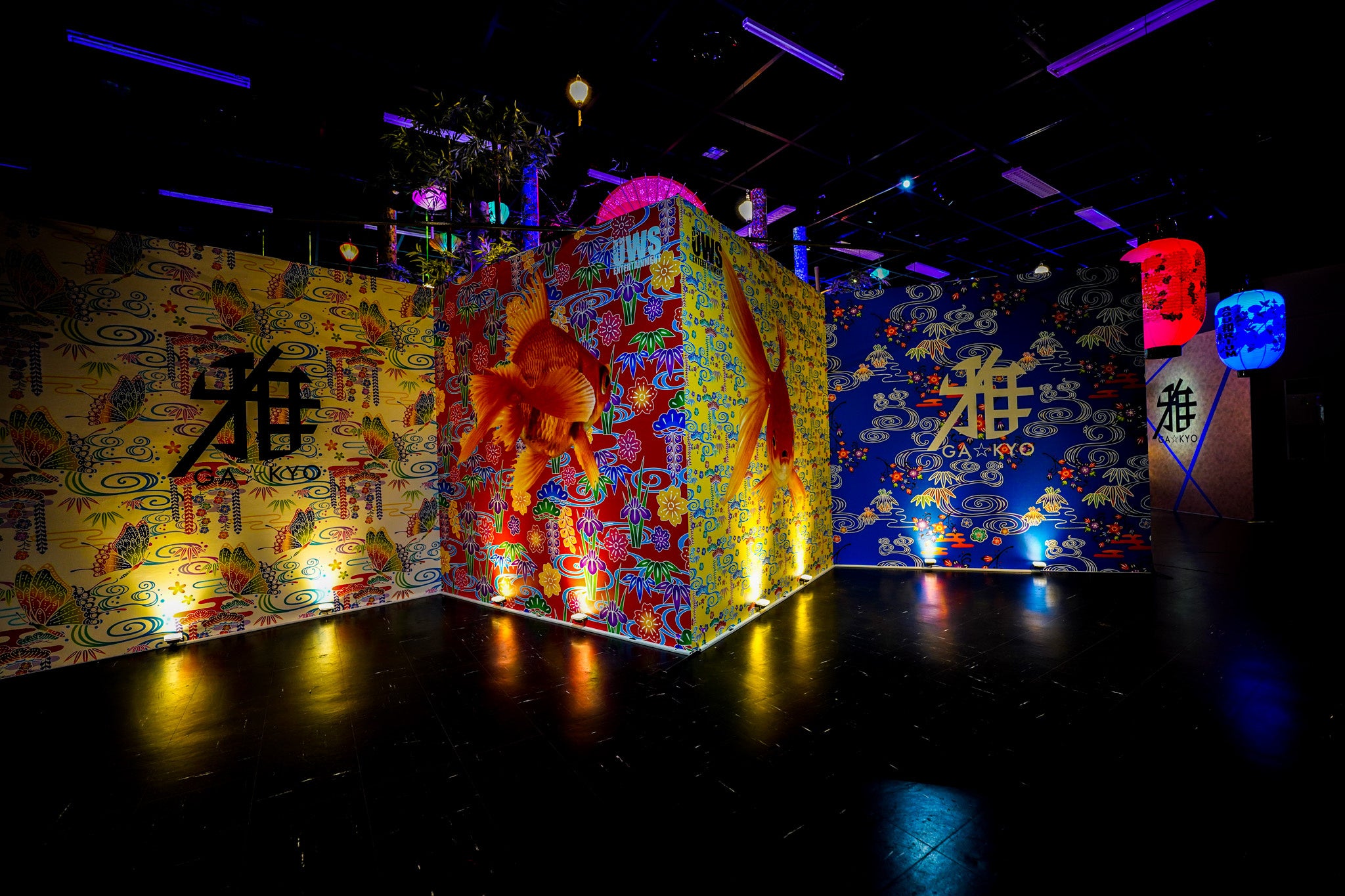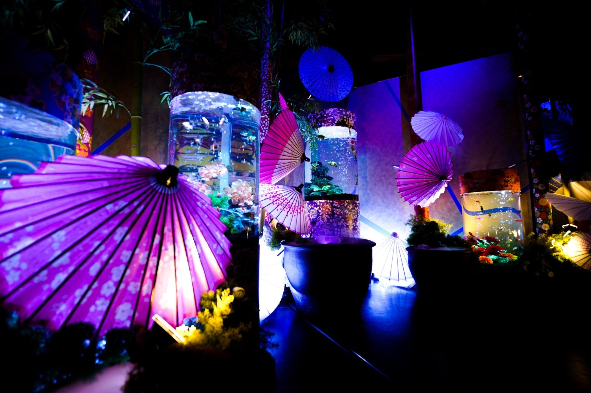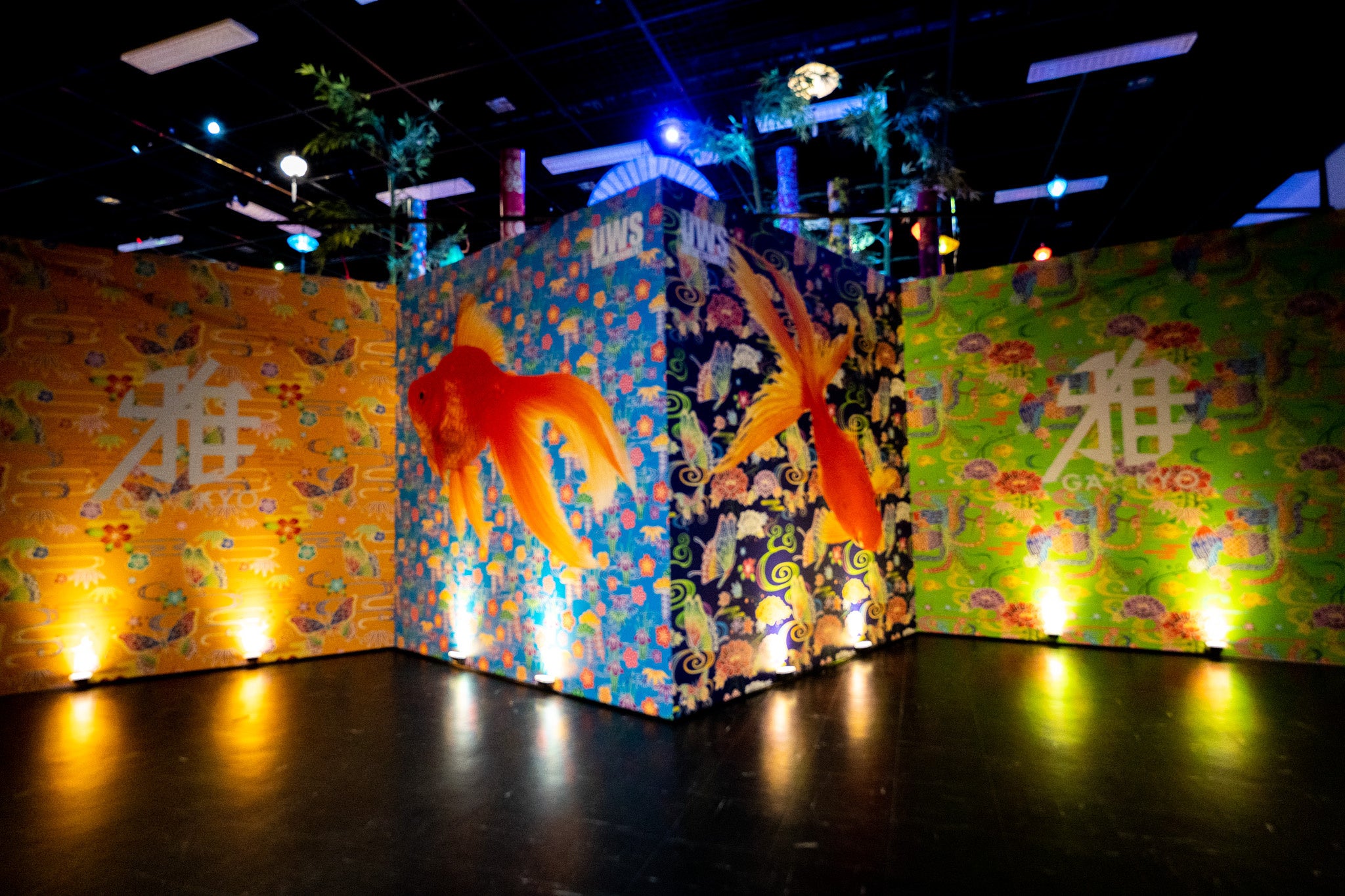 日本の伝統・伝説×アクアリウム のアート施設「UWS AQUARIUM GA☆KYO(お台場)」の龍宮城エリアのコンセプトをベースとし、沖縄の歴史や伝統文化をアクアリウムで表現。中国から琉球(沖縄)を経て薩摩(鹿児島)に持ち込まれ、後に日本全土へ普及していったとされる金魚「琉金」をメインに、30種700匹の金魚を約200坪の空間へ展示しました。