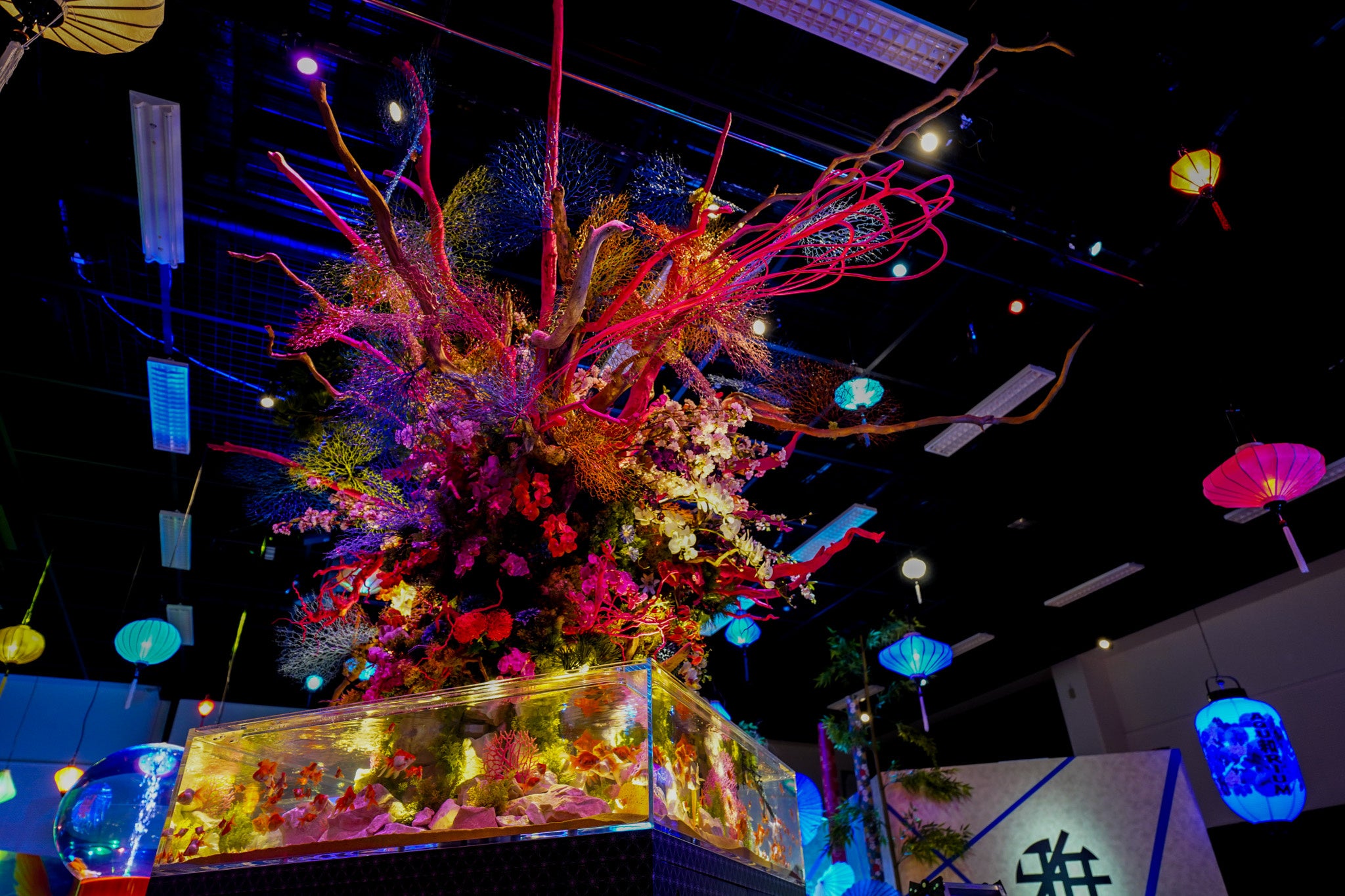 『GA☆KYOメインアートワーク琉球の海の中の竜宮城をイメージし珊瑚礁を流木と盆栽の奇抜な色彩で雅に表現』