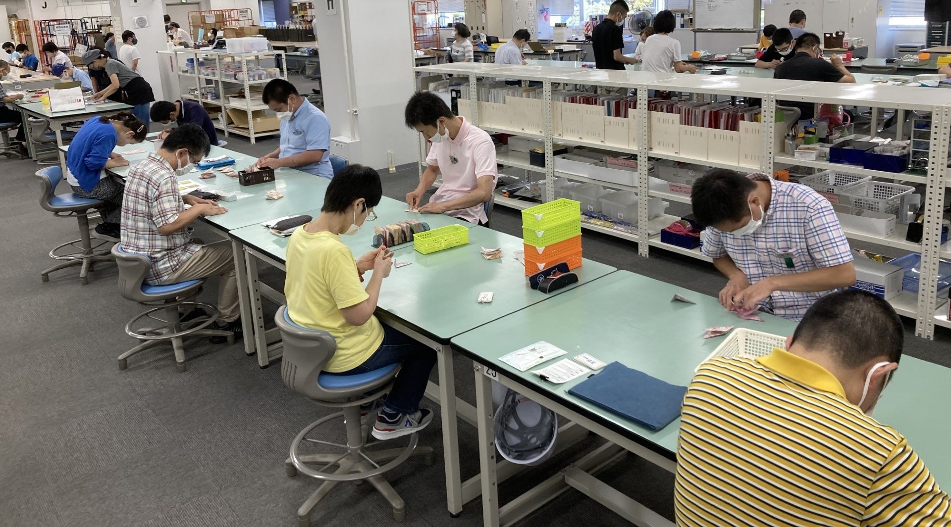 三越伊勢丹ソレイユは、2004年9月に創業。社員の多くは知的障害があり、職業重度判定を受けています。しかし彼らは卓越した集中力と単純作業をやり抜く高い反復力を持ち、優れた作業性を発揮するのが強みです。これまで店頭のスタイリスト(販売員)が行ってきた、ギフト用リボンやラッピング資材の加工・製作などの付帯業務を担い、年間6万時間分の業務削減に貢献。その分、店頭スタイリストはお客さまへの接客時間にあてることができます。また、出来上がり品の精度の高さから、最近ではお客さまにお渡しするノベルティ制作などの依頼も増え、業務の幅が広がっています。