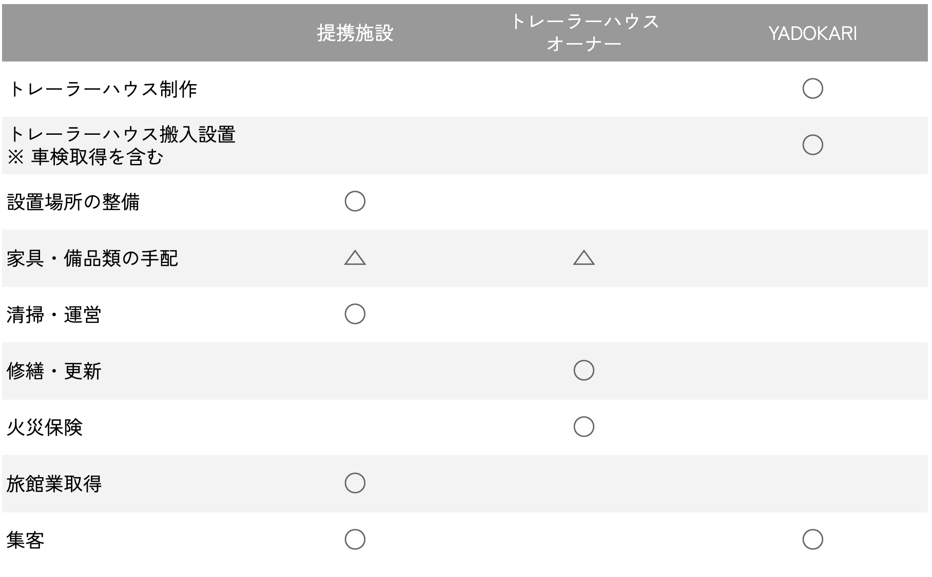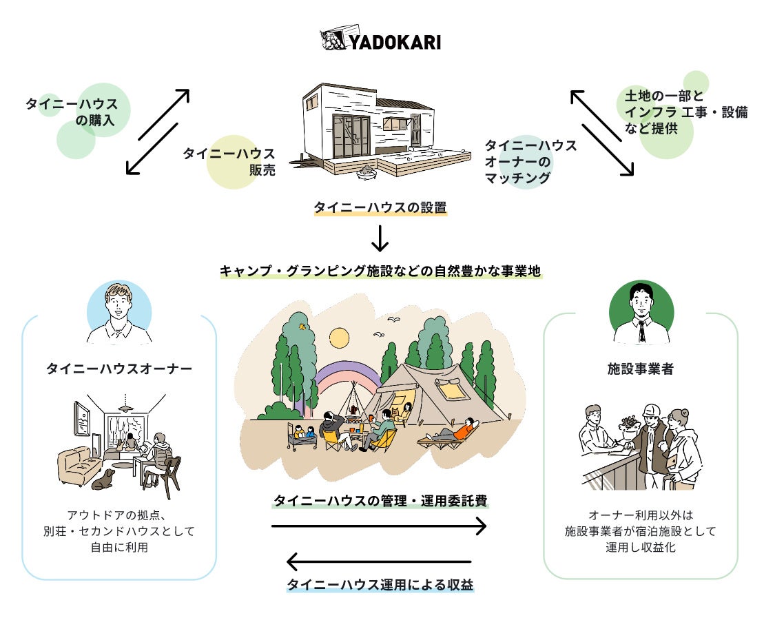 宿泊施設側は運営している土地の一部をYADOKARIが運営するWebサイト「TINYHOUSE ORCHESTRA」にて掲載しタイニーハウスオーナーの募集を行います。募集開始後はオーナー希望者と利用条件などマッチングした後にタイニーハウスの製造〜設置までをYADOKARIが実施します。